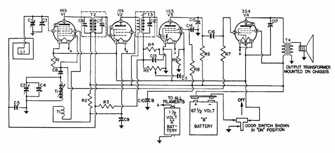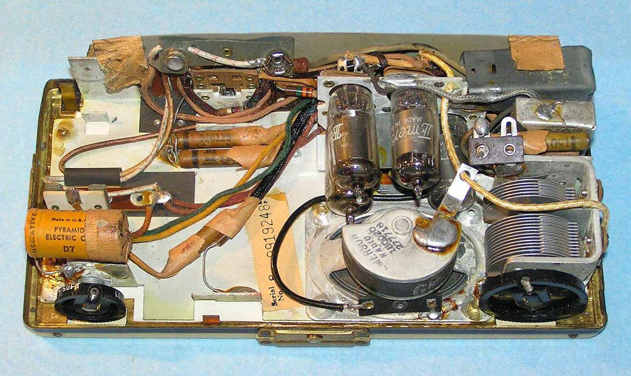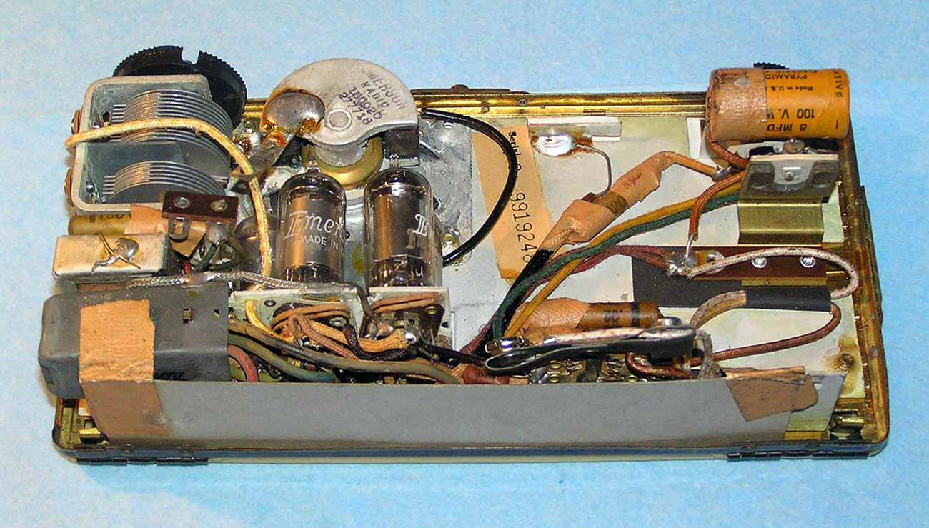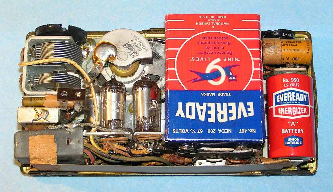 в верхнюю крышку петлевая антенна. Питание от 2-х батарей, на 1,5 и 67,5