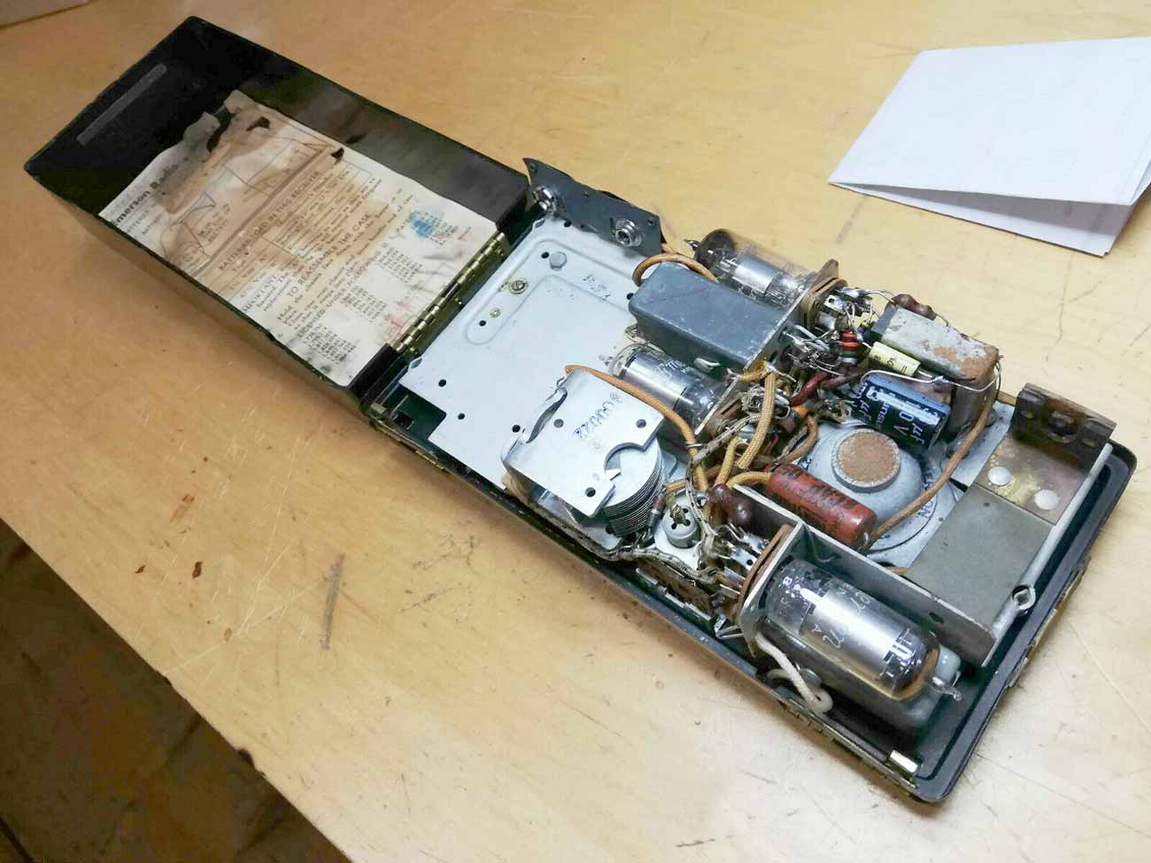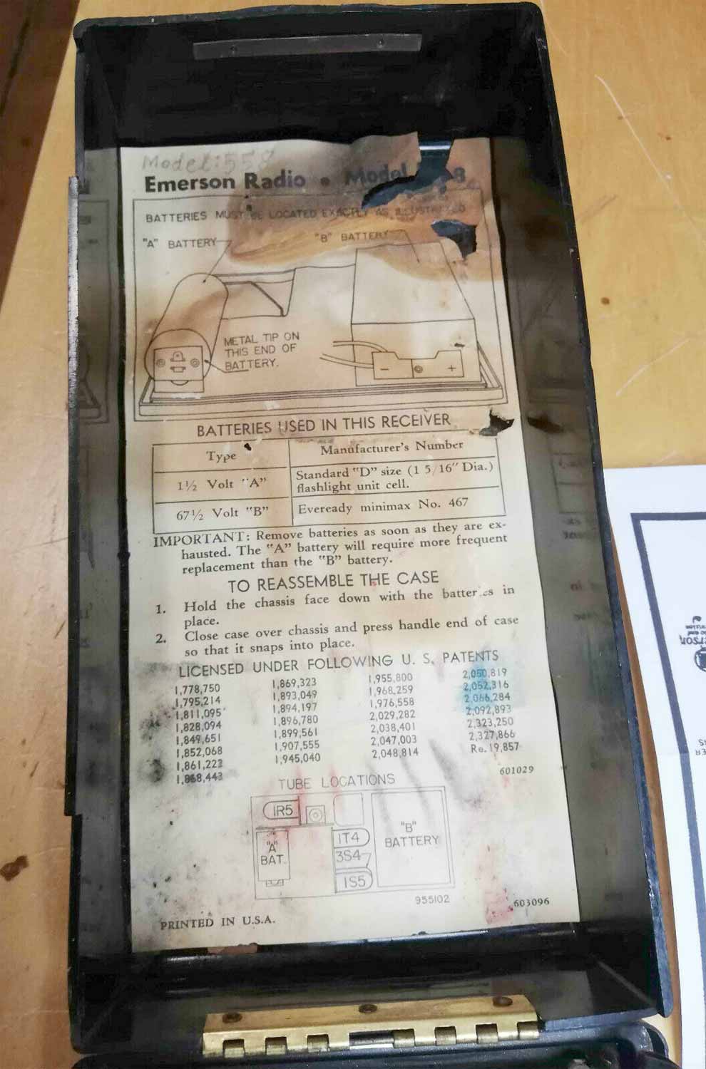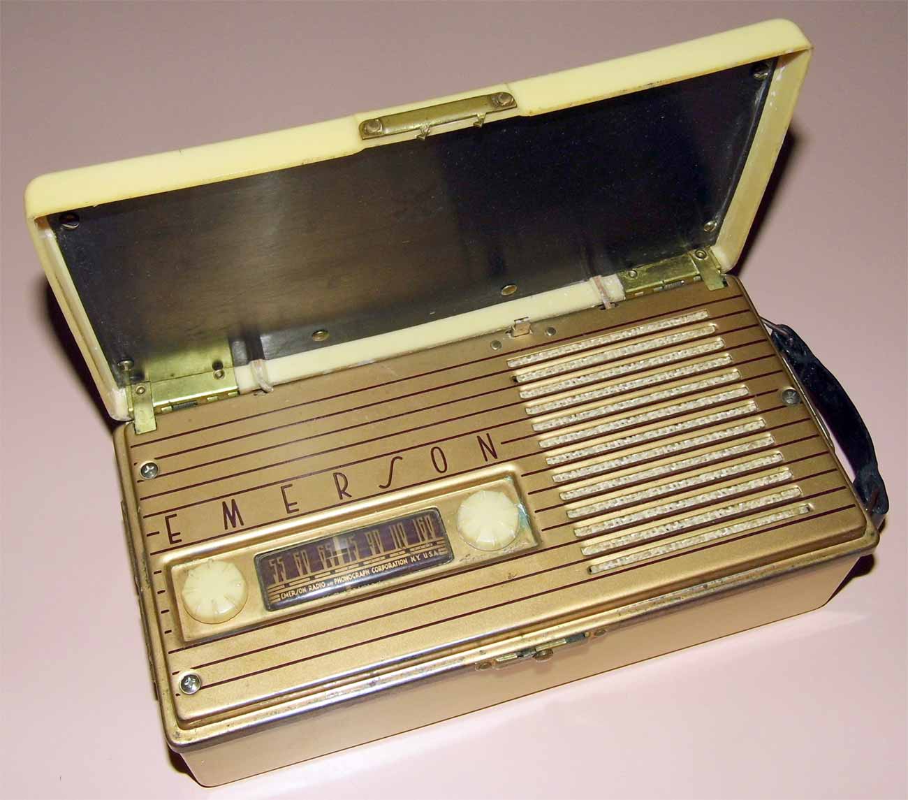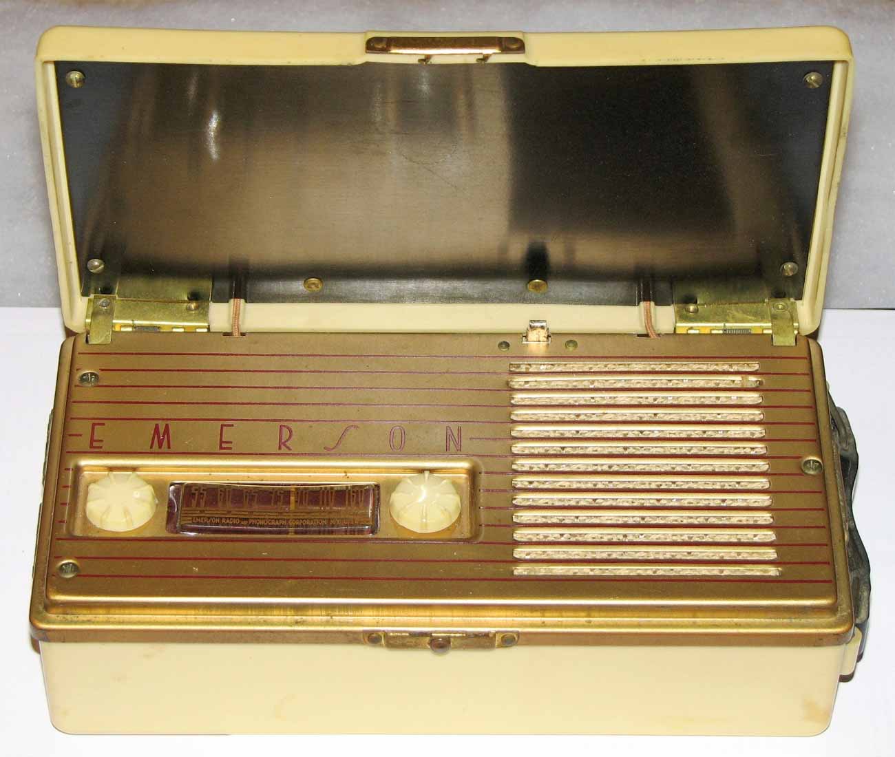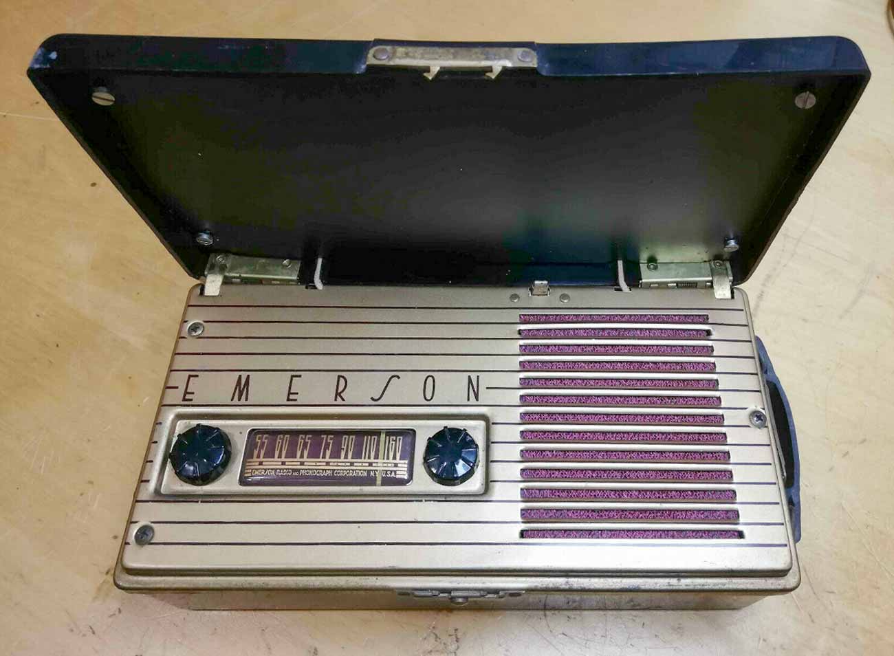 Портативный ламповый радиоприёмник "Emerson 558" выпускался с 1948 года "Emerson Radio & Phonograph Corp". США. Четыре радиолампы. Диапазон СВ. размеры: 218х110х62 мм; масса без батарей: 1,2 кг.