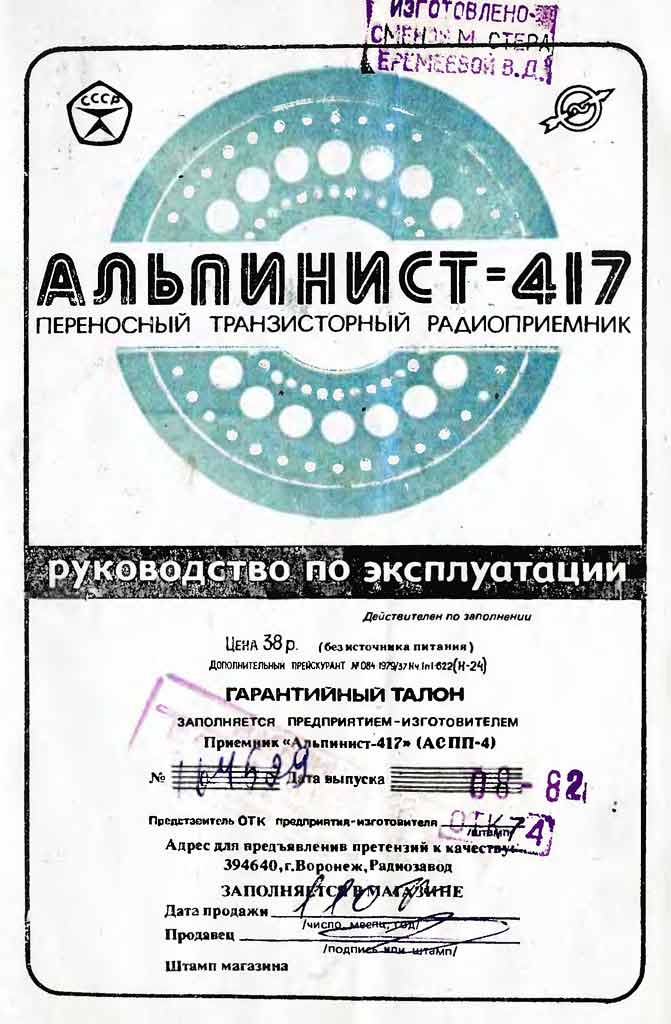 38 рублей. В 1981 году в схему радиоприёмника "Альпинист-417" были внесены
