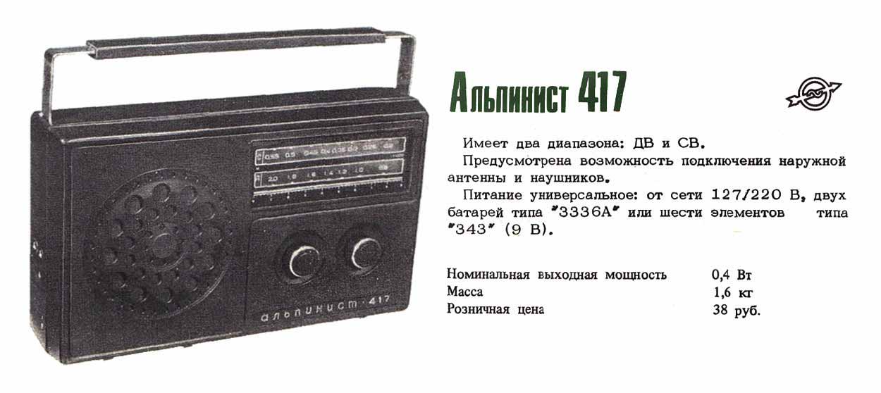 мм. Масса "417" модели 1,7 кг. Цена радиоприёмника ''Альпинист-417'' -