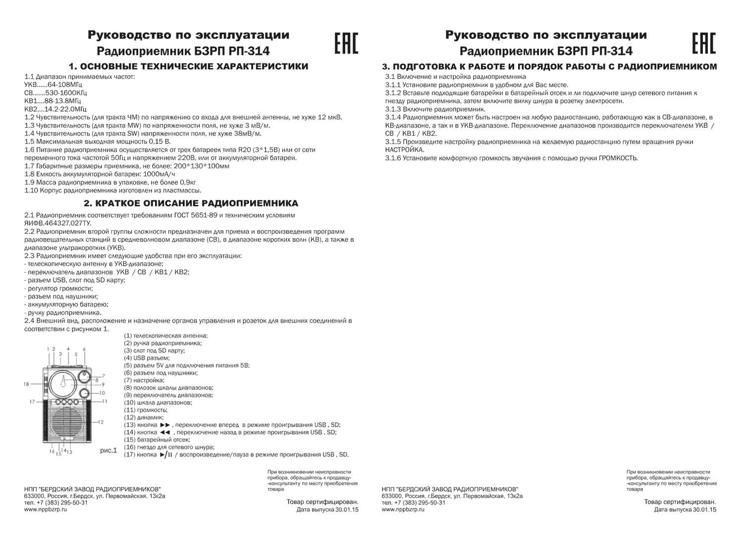 Радиоприёмник "БЗРП РП-314" с 2015 года производил Бердский завод радиоприёмников. Радиоприёмник имеет диапазоны СВ, два поддиапазона КВ и расширенный УКВ + проигрывание файлов MP-3.