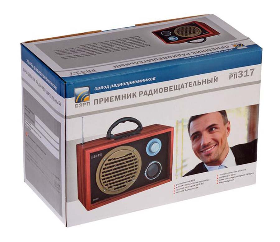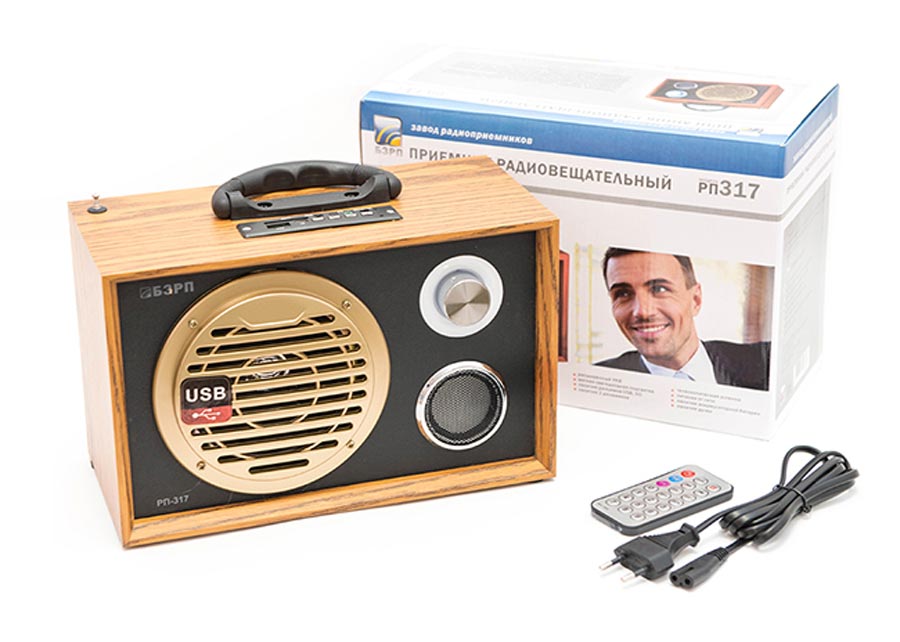 Радиоприёмник "БЗРП РП-317" выпускал с 2015 года НПП Бердский завод радиоприёмников. Диапазон УКВ 64-108 МГц. Проигрывание файлов MP-3. Питание от сети или аккумулятора.