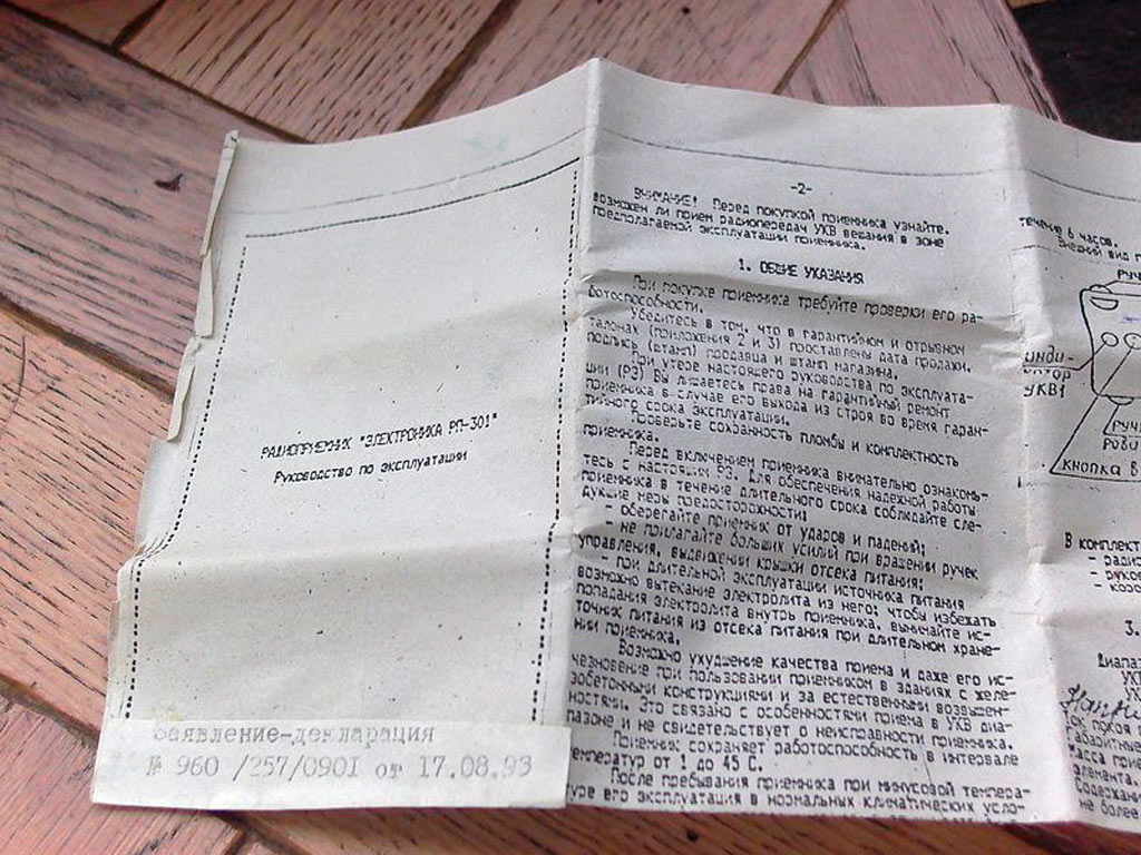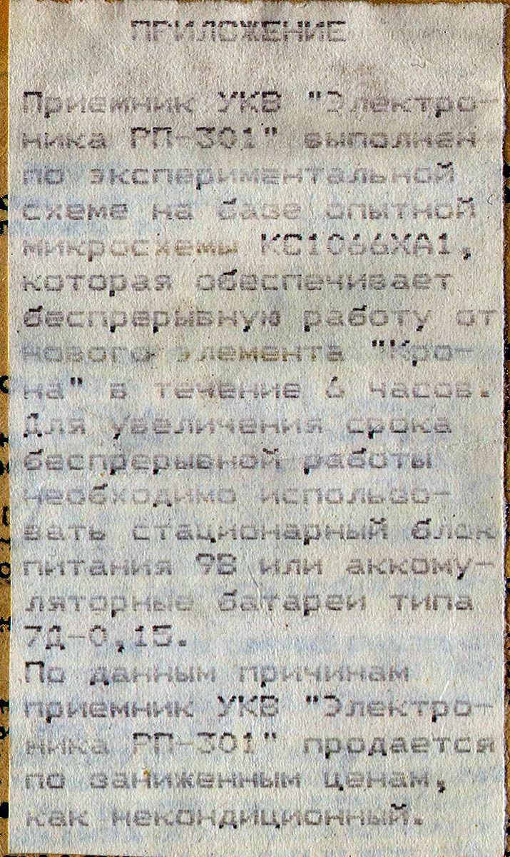 Портативный УКВ радиоприёмник "Электроника РП-301" выпускался предположительно с 1993 года заводом "Орбита" в городе Нижнем-Новгороде.