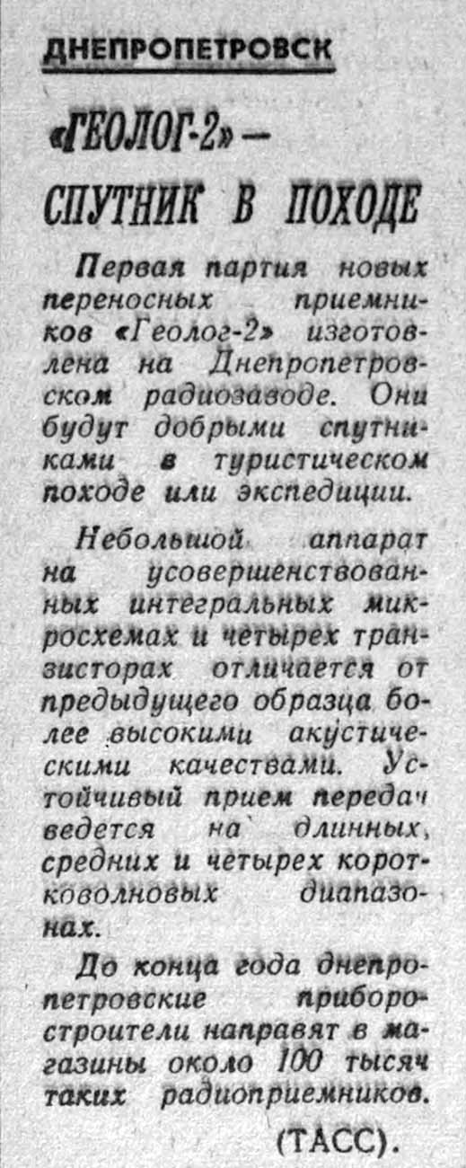 транзисторный радиоприемник "Геолог-2" с 1974 года выпускал Днепропетровский