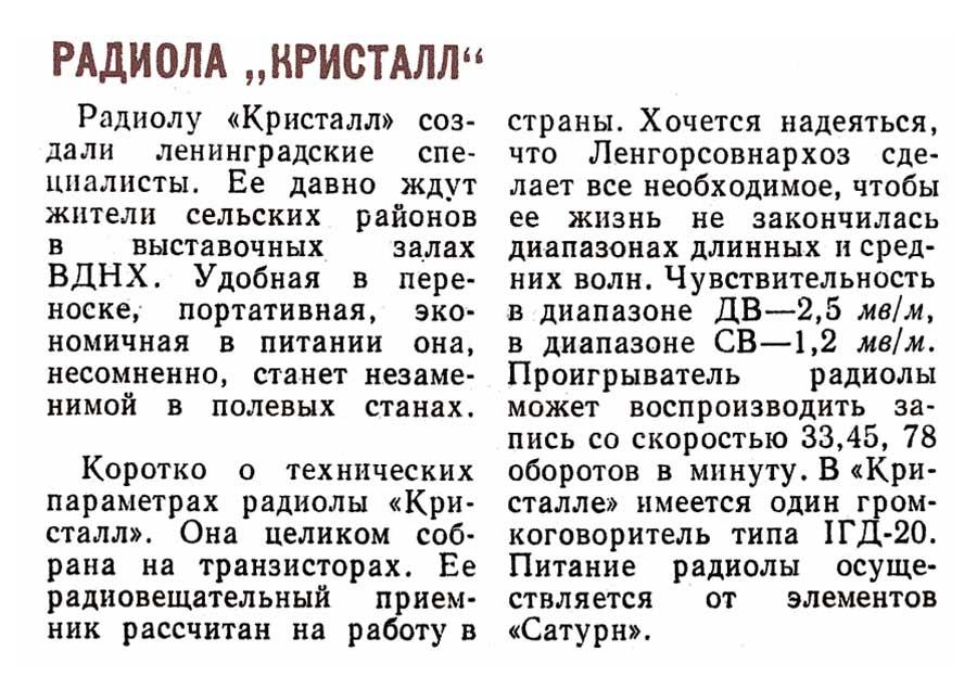 Рекламное описание радиолы "Кристалл"