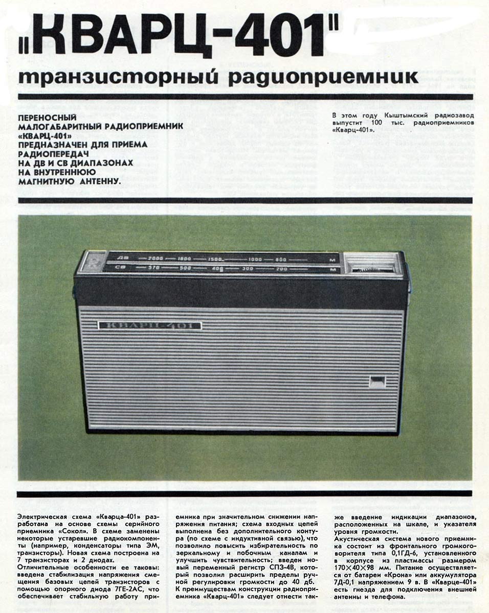 "Кварц-401" с 1970 года выпускал Кыштымский радиозавод. Радиоприёмник предназначен