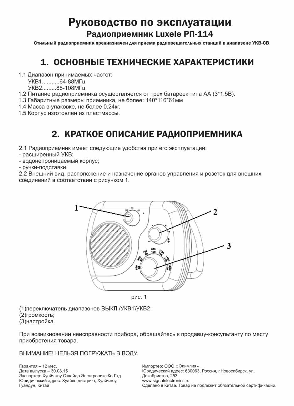 Радиоприёмник "Luxele РП-114" выпускался с 2019 года. Импортёр: ООО "Олимпия", город Новосибирск. Экспортёр: Китай. Приёмник предназначен для домохозяек как эфирная радиоточка.