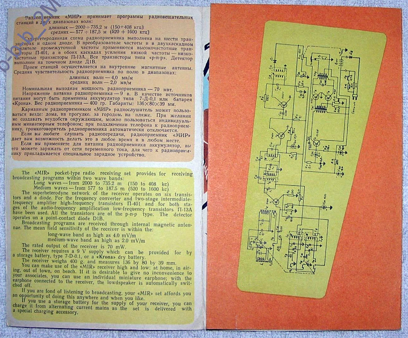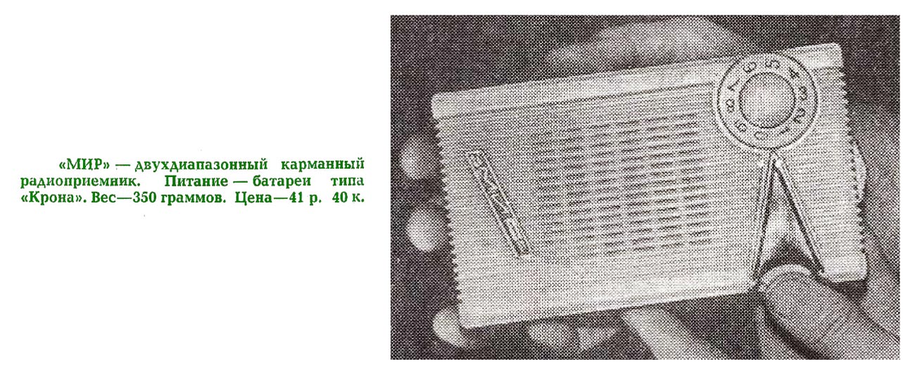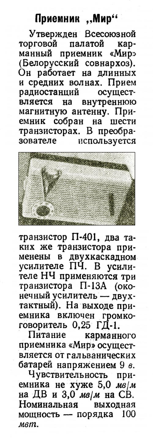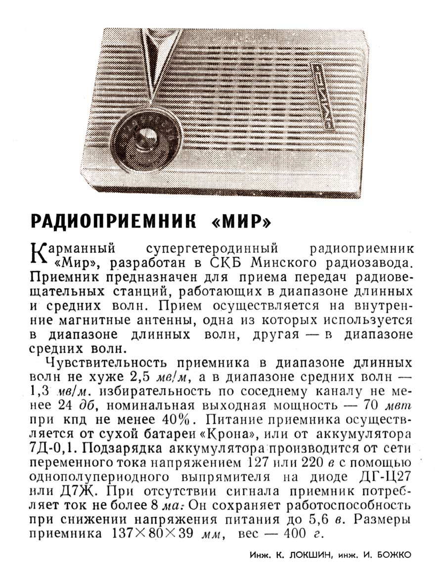 Супергетеродинный радиоприёмник ''Мир'' разработан в СКБ Минского радиозавода.