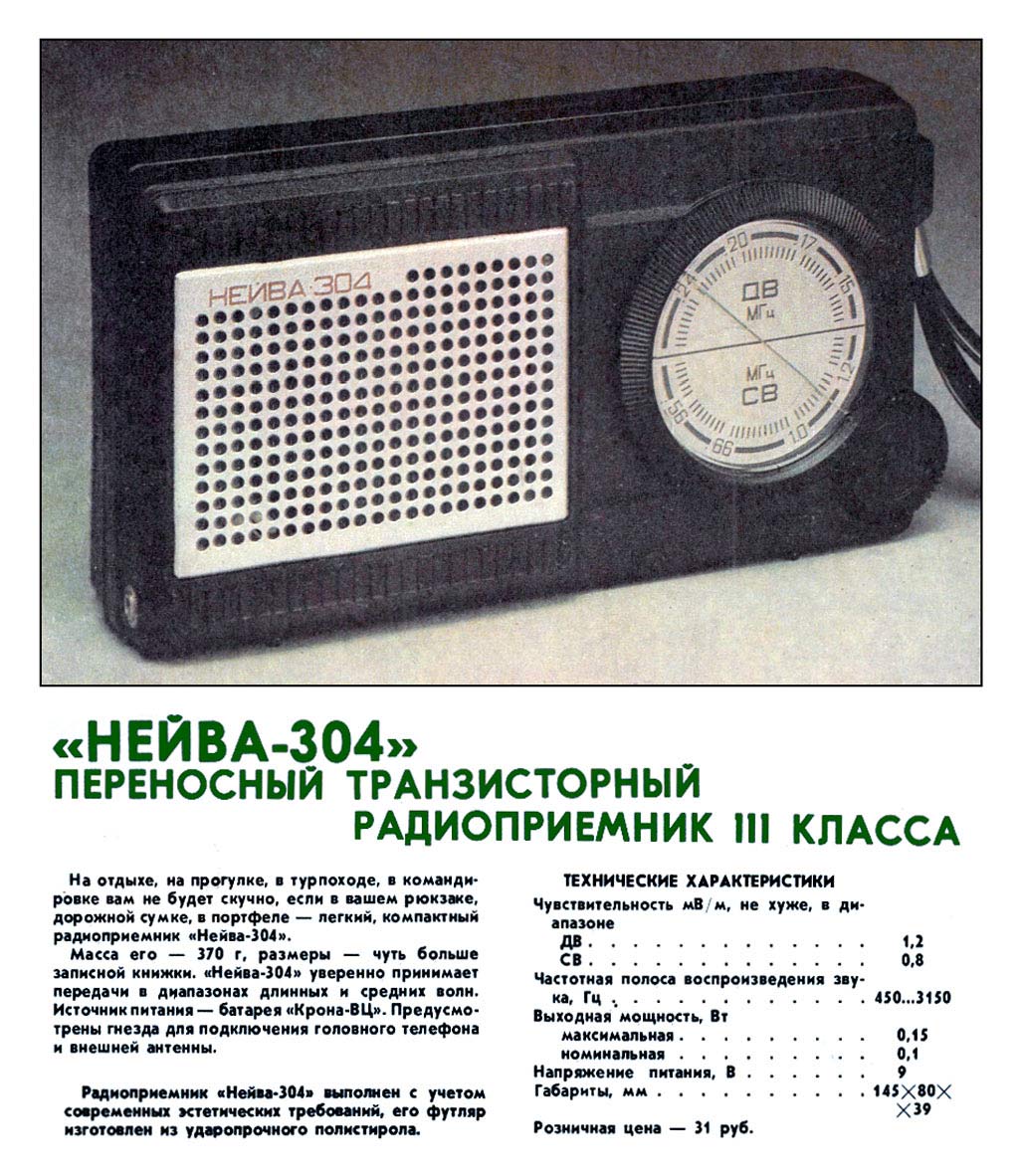 Масса 450 гр. Радиоприёмник ''Нейва-304'' ничем, кроме класса и наименования