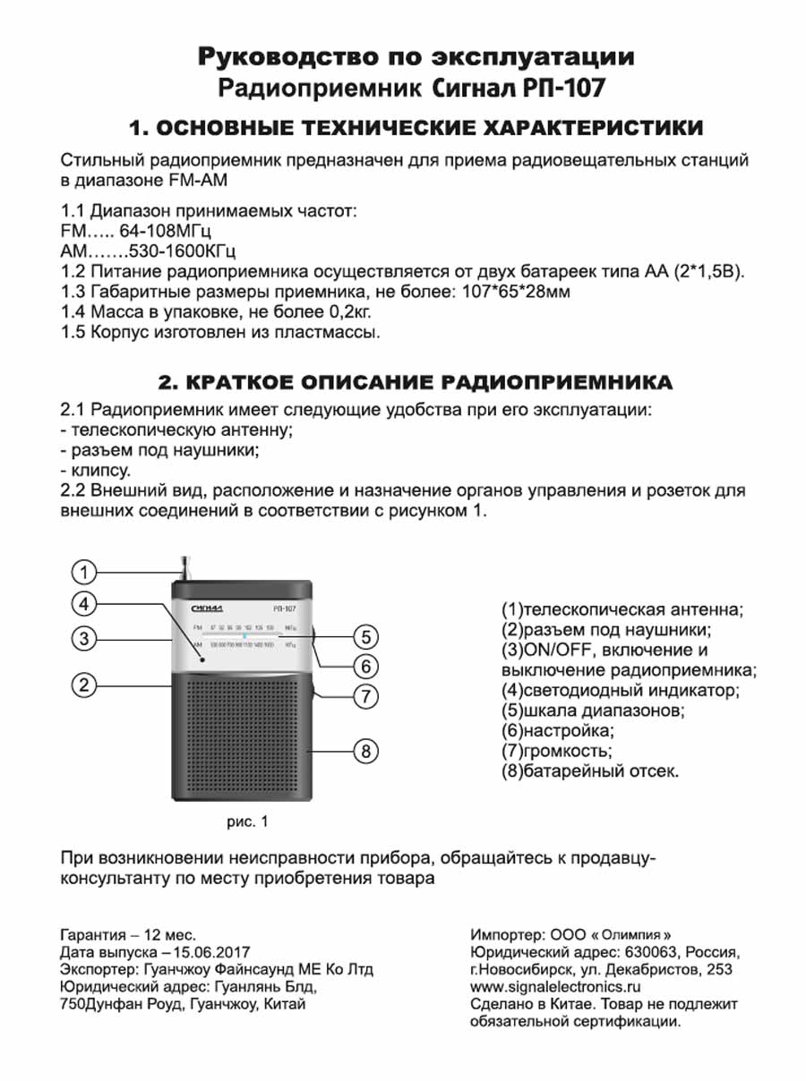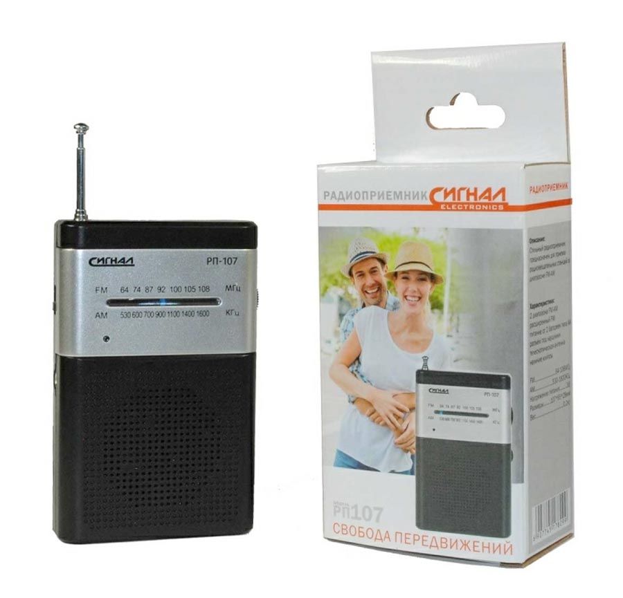 Радиоприёмник "Сигнал РП-107" выпускался возможно с 2017 года. Изготовитель Китай. Потребитель ООО "Олимпия", Новосибирск. Диапазоны: СВ, УКВ. Питание АА.