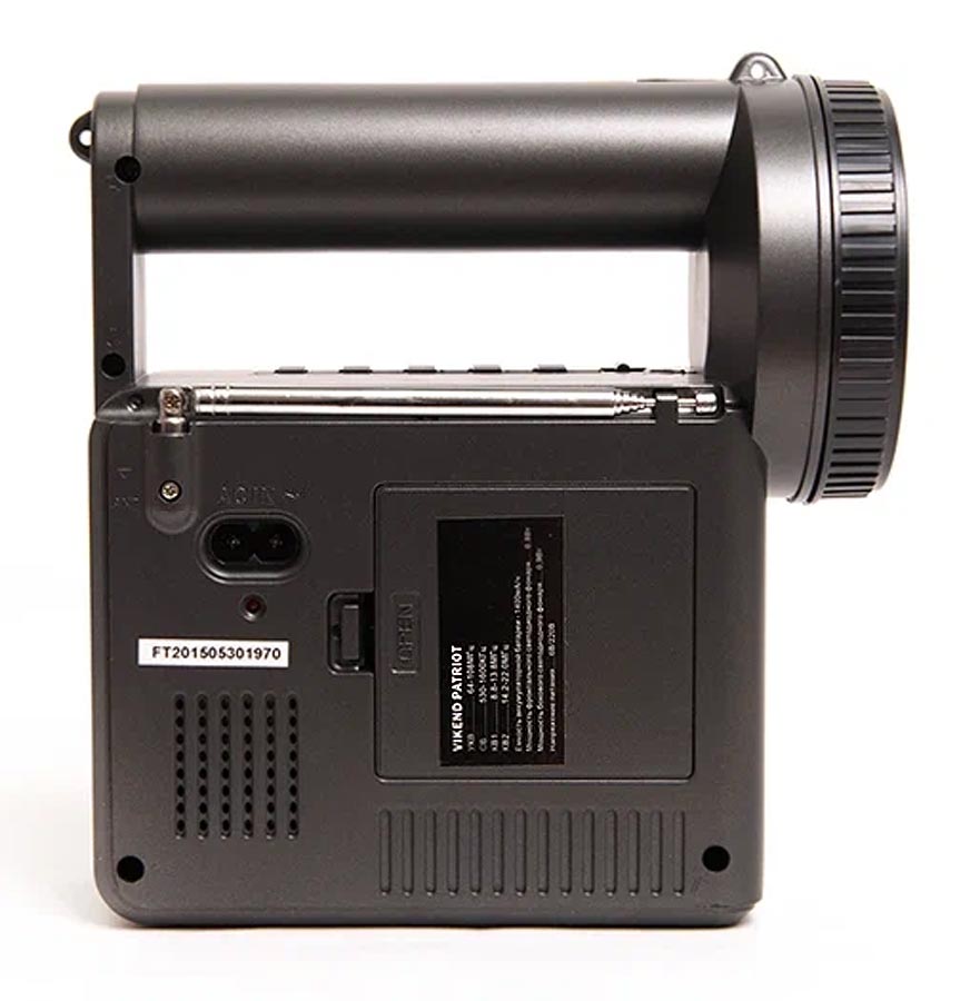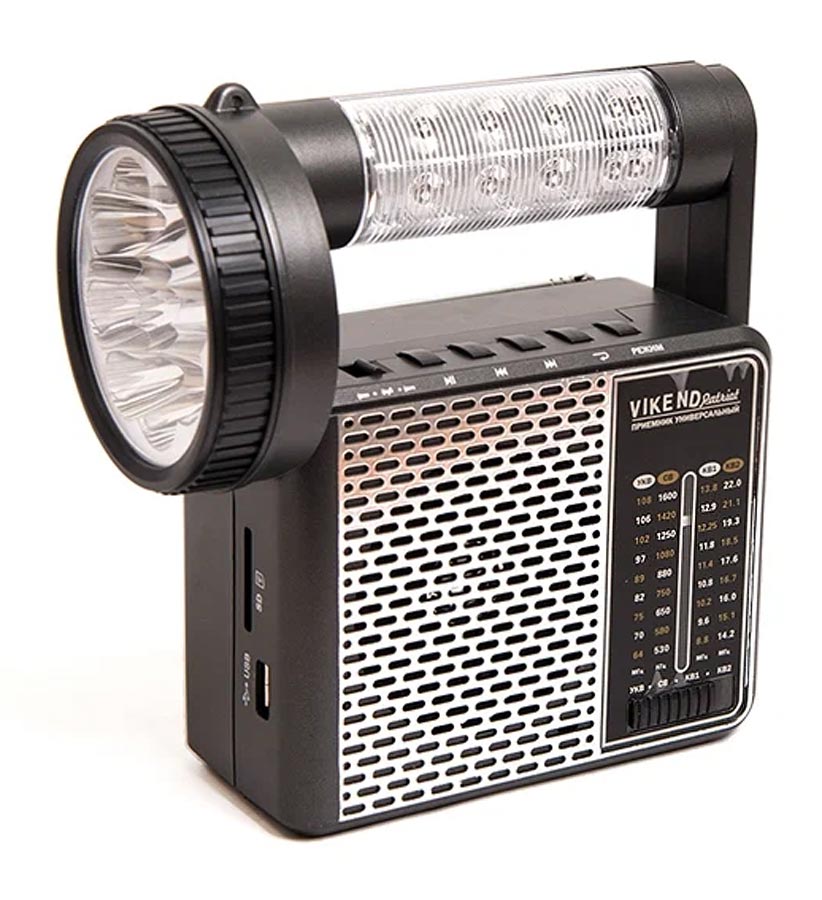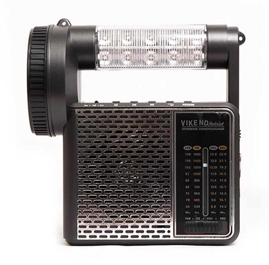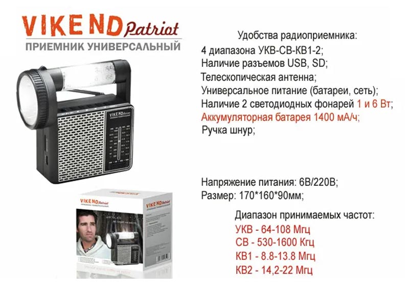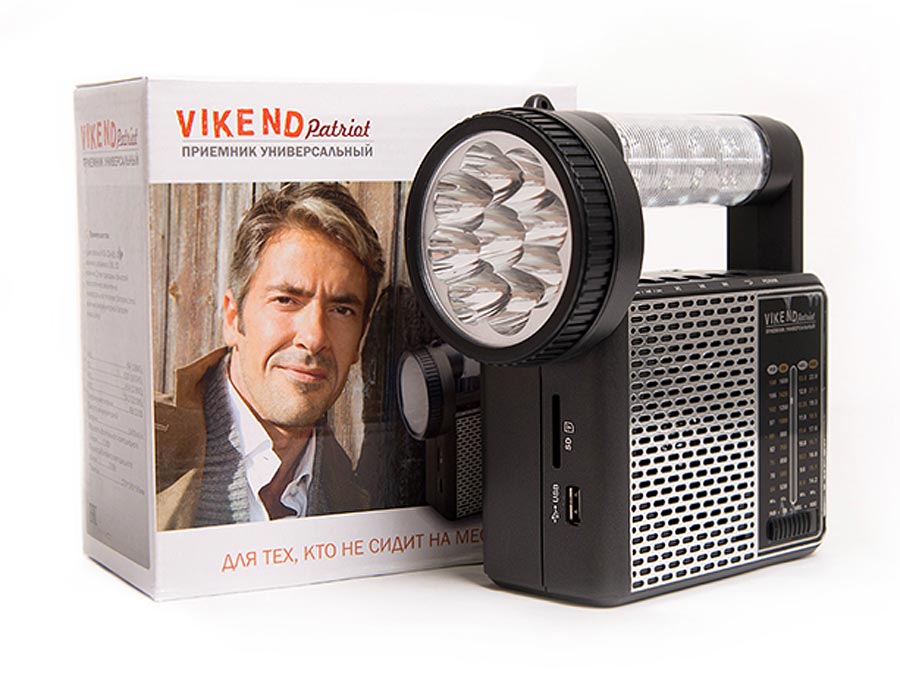 Радиоприёмник "Vikebd Patriot" выпускался с 2014 года. Экспортёр - Китай. Импортёр - ООО "Олимпия", город Новосибирск. Диапазоны УКВ, СВ, КВ (2). Поддержка MP-3. 2 светодиодных фонаря. Видеосюжет.