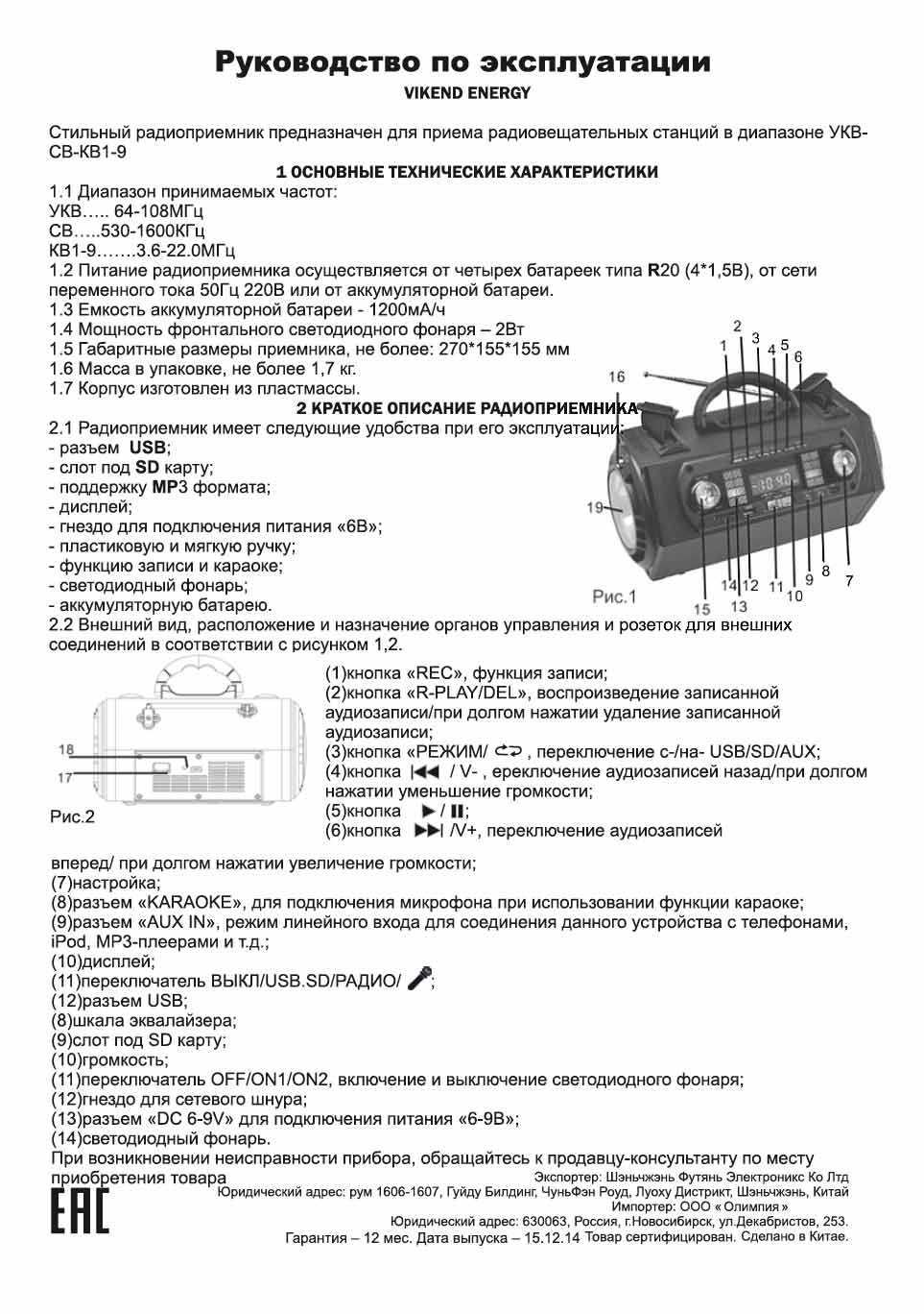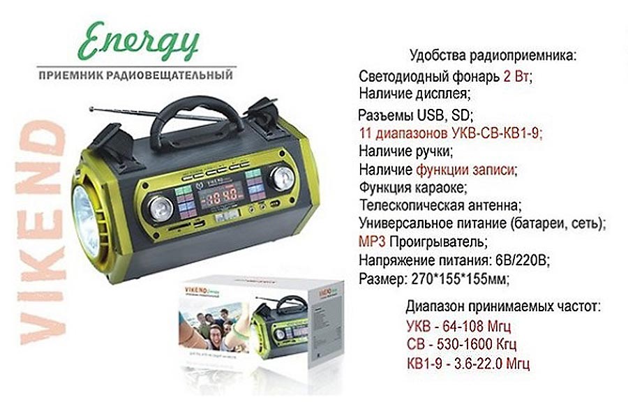 Радиоприёмник "Vikend Energy" выпускался предположительно с 2018 года. Экспортёр Китай. Импортёр ООО "Олимпия". Новосибирск. Многофункциональный переносной аппарат.