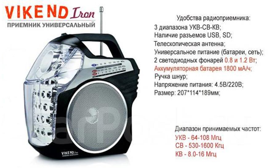 Радиоприёмник "Vikend Iron" выпускался возможно с 2015 года. Экспортёр - Китай. Импортёр - ООО "Олимпия", Новосибирск. Диапазоны: СВ, КВ, УКВ. Поддержка MP-3. Два фонаря. Видеосюжет.