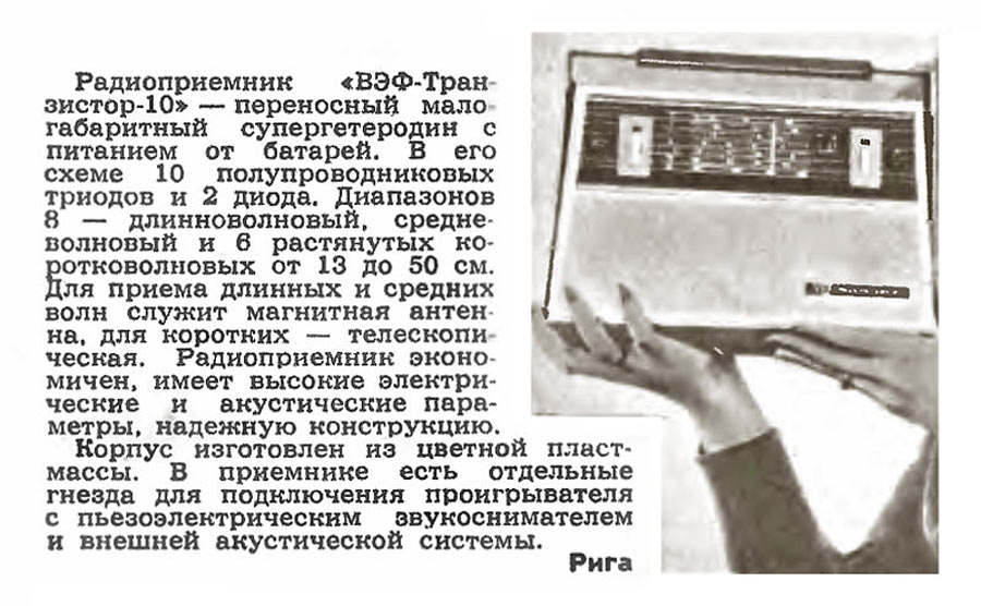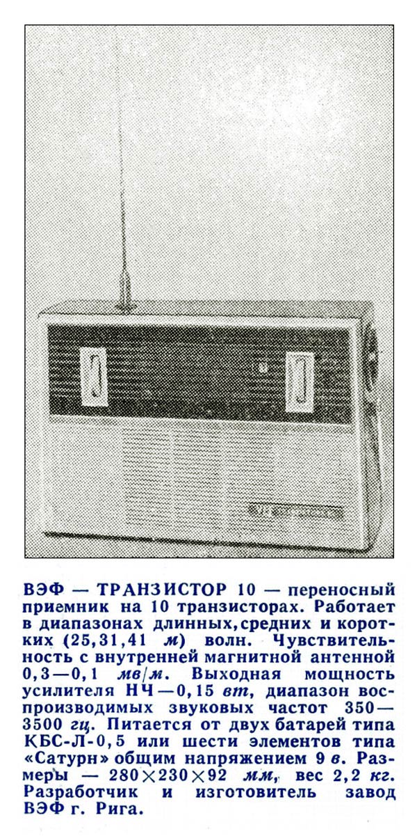 "ВЭФ". ''ВЭФ-Транзистор-10'' - это переносный радиоприёмник на 10 транзисторах.