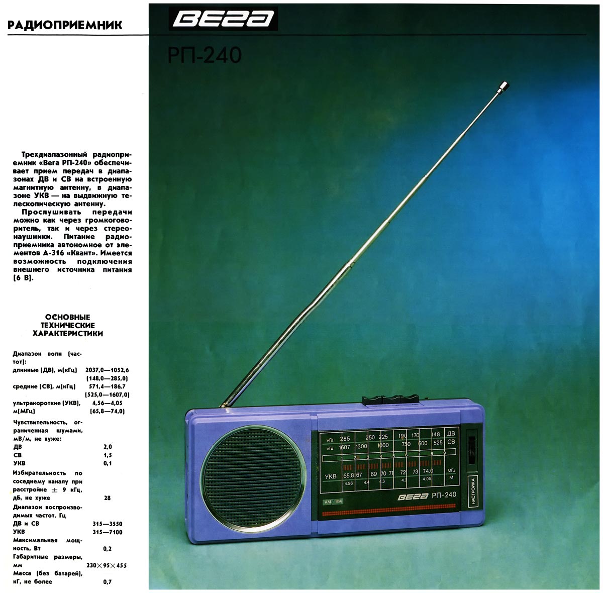 Описание радиоприёмника "Вега РП-240" в справочнике.