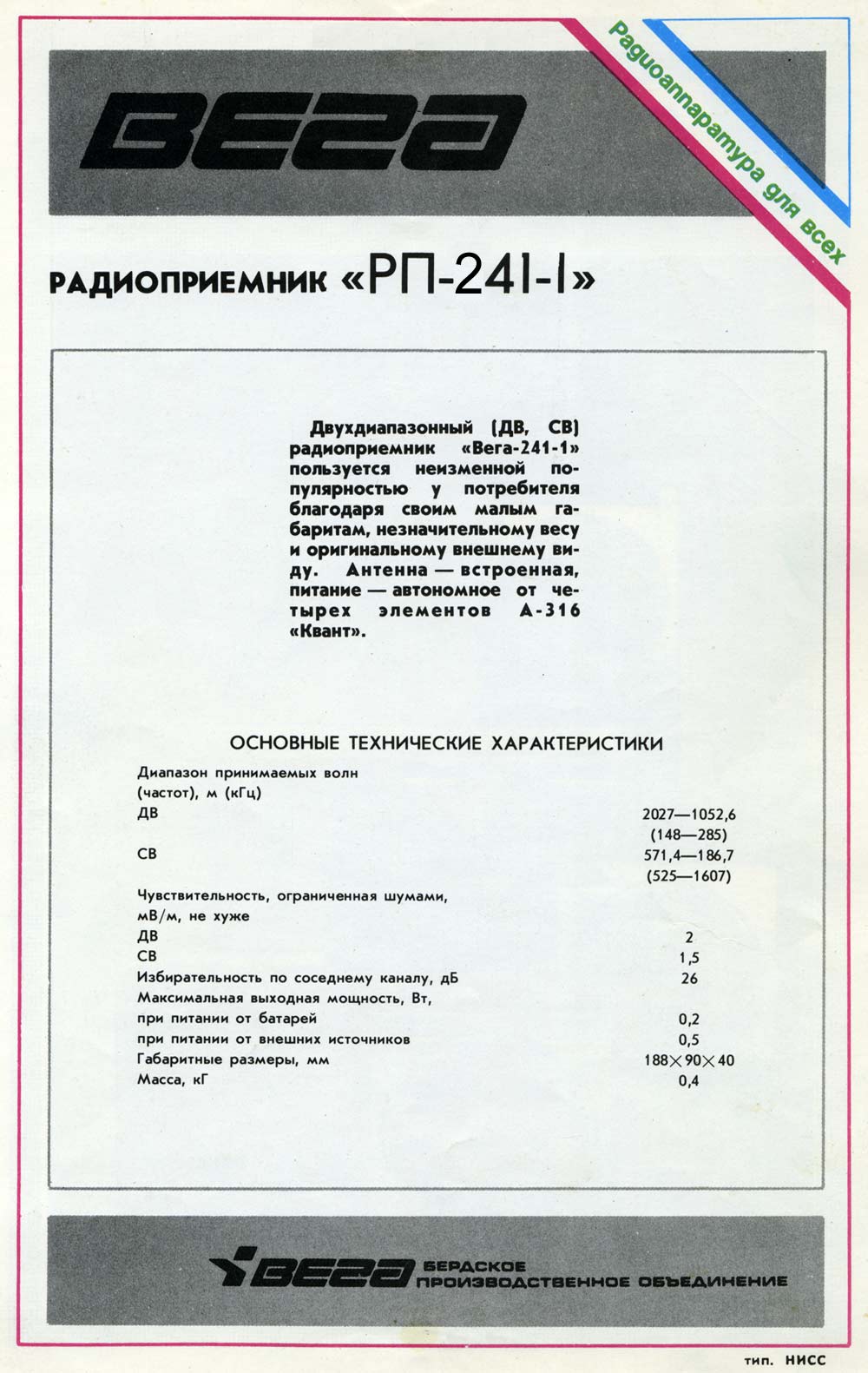 "Вега РП-241-1" с 1990 года выпускало Бердское ПО "Вега". Радиоприёмник