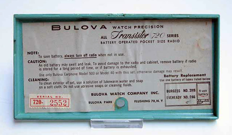 "Bulova Watch", Нью-Йорк, США. Супергетеродинная схема на 7-ми транзисторах.