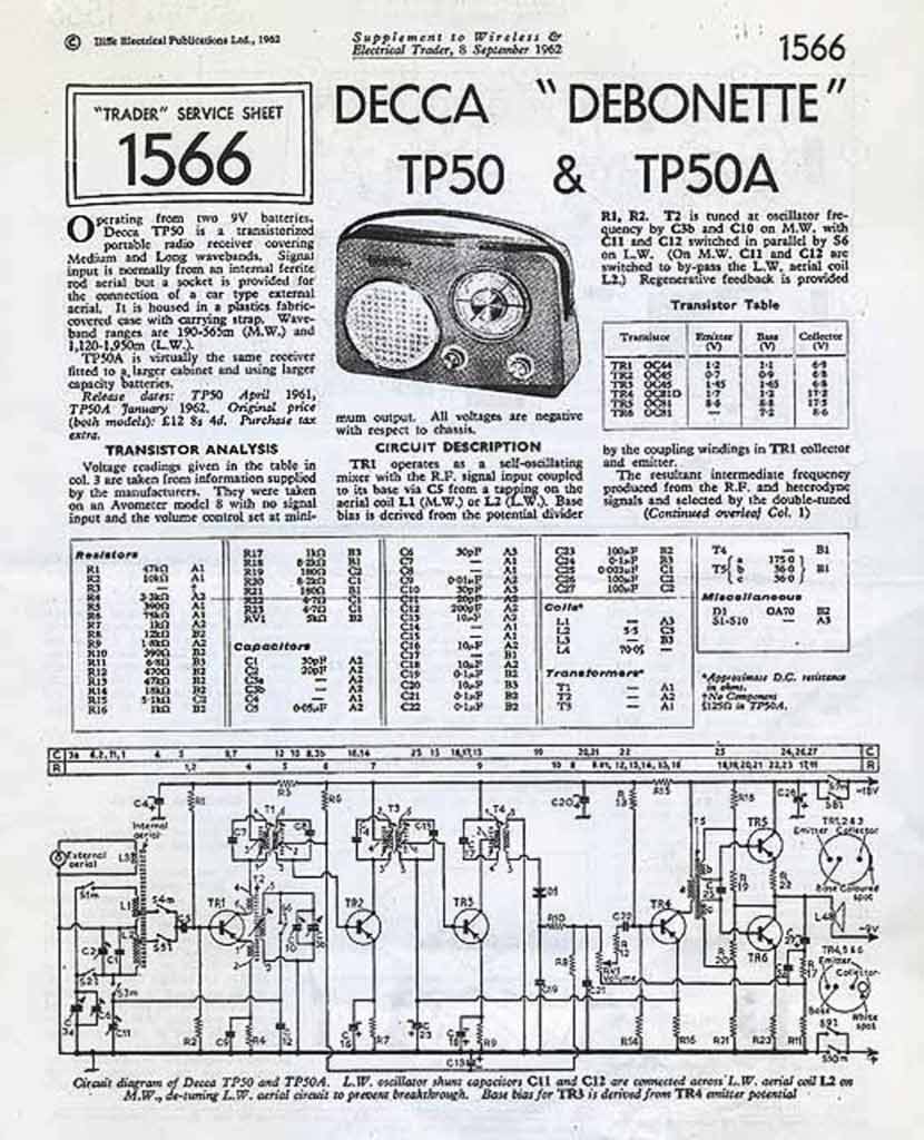 TP50" выпускался с 1961 года компанией "Decca", Лондон. Супер. 6 транзисторов.