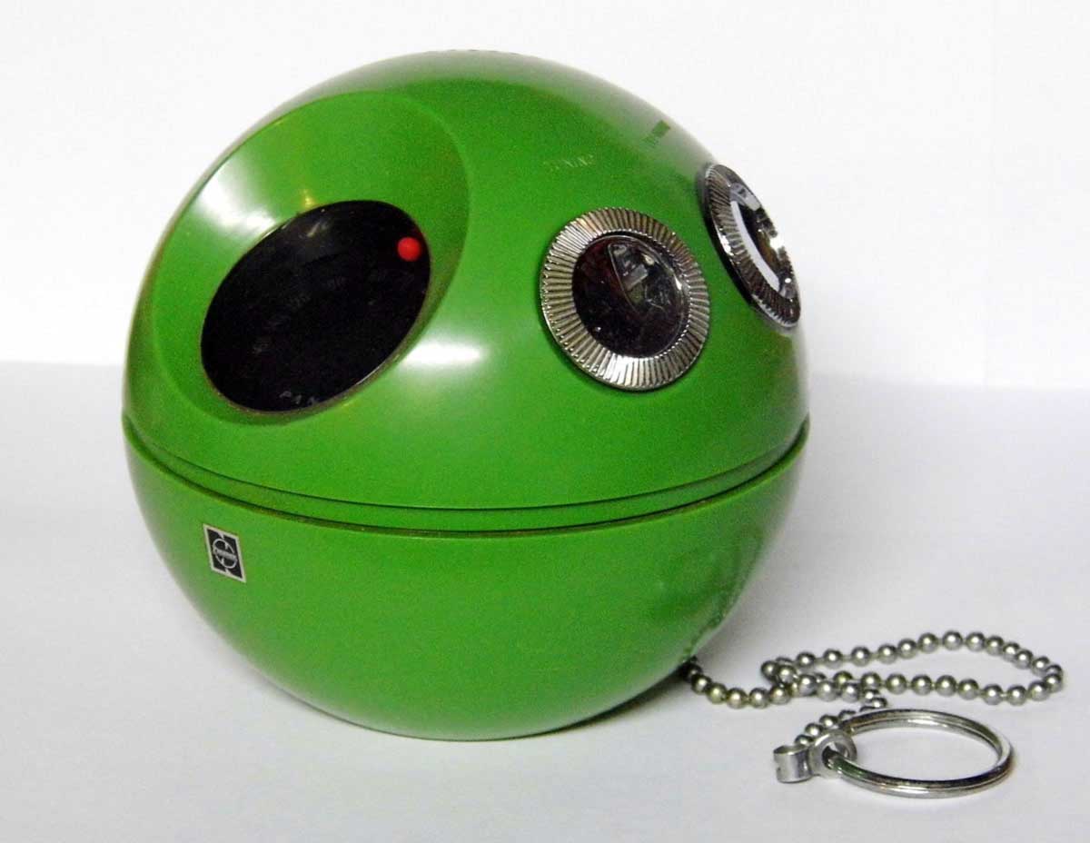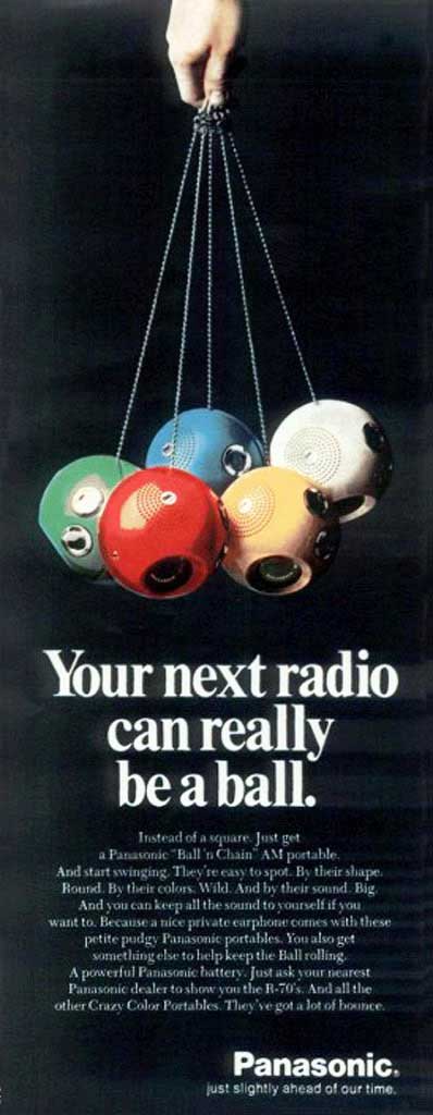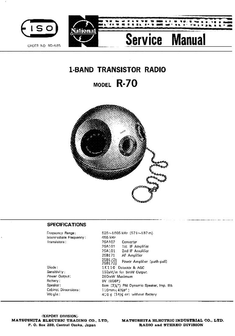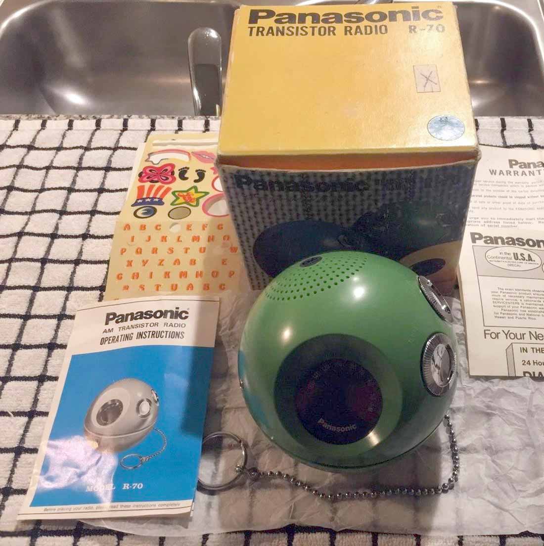 Портативный сувенирный радиоприёмник "Panasonic R-70" выпускался с 1969 года Японской компанией "Panasonic Matsushita". Супергетеродин. Шесть транзисторов. Диапазон MW - 525...1605 кГц. ПЧ - 455 кГц. АРУ. Питание - 9 вольт. Максимальная выходная мощность - 250 мВт. Диапазон воспроизводимых частот - 300...4000 Гц. Громкоговоритель диаметром 6 см. Диаметр шара - 110 мм. Масса с батареей 400 грамм.