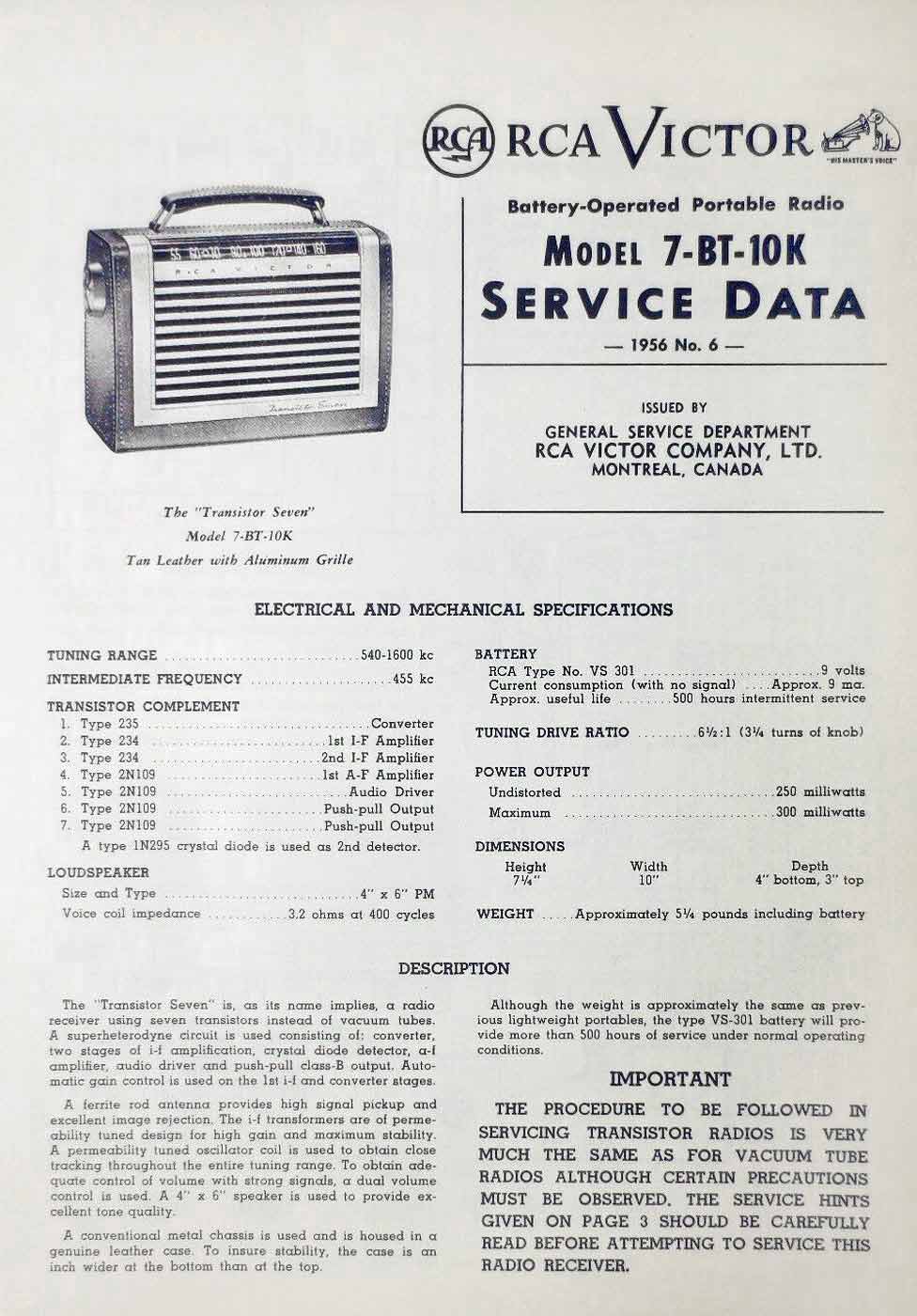 7BT-10K" выпускался с 1955 года компанией "RCA Victor", США. Супергетеродин.