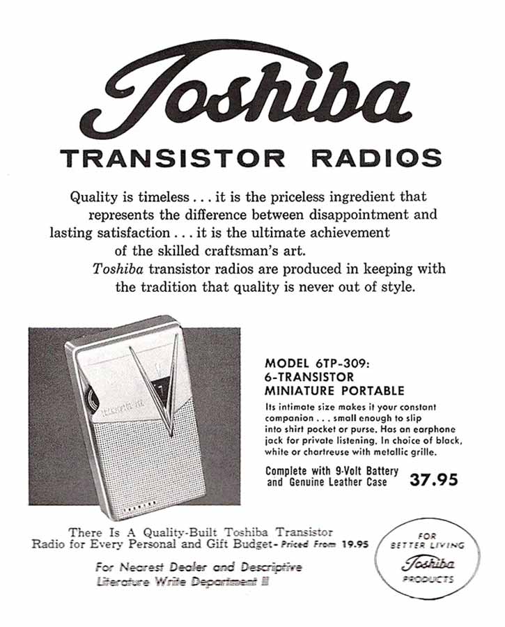 Co. LTD. (Toshiba), Кавасаки, Япония. Супергетеродин на шести транзисторах.