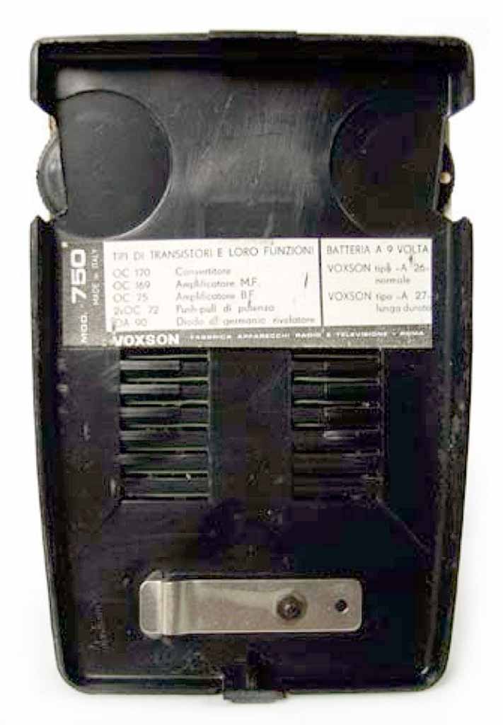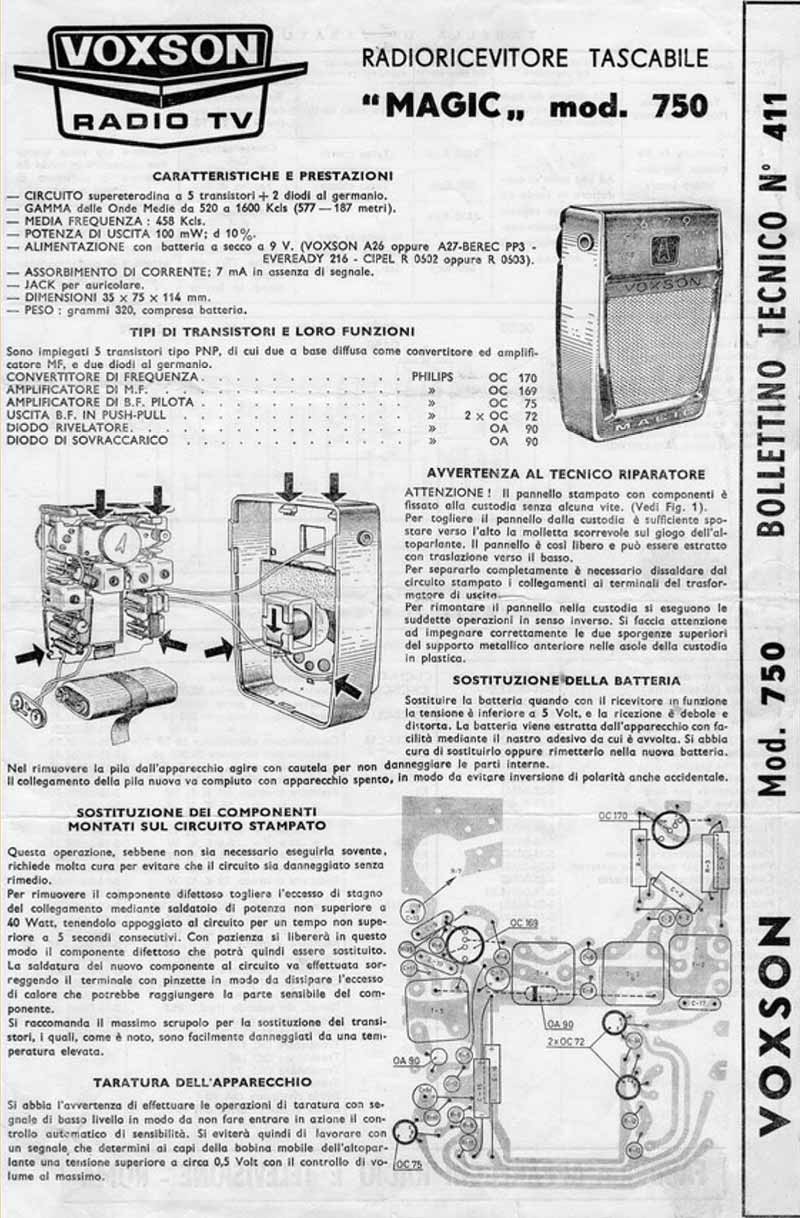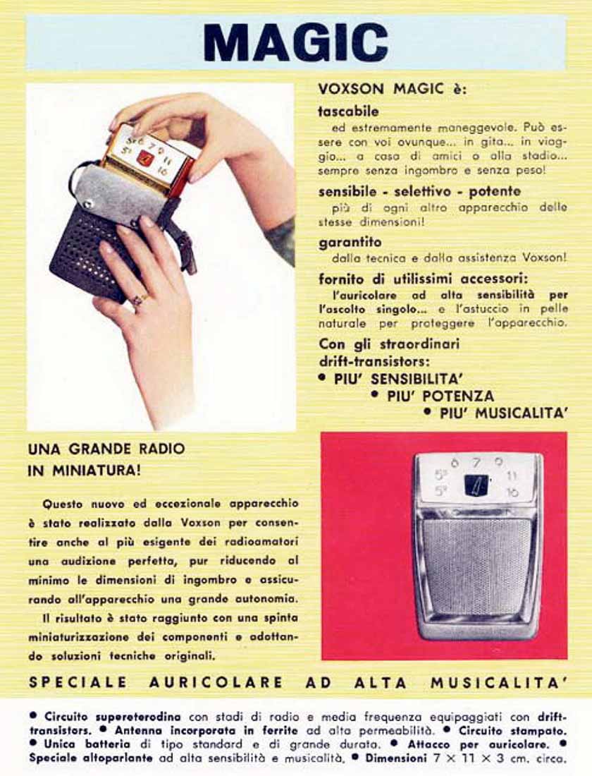 Портативный радиоприёмник "Voxson 750" (Magic) выпускался с 1960 года компанией Voxson F. A. R. E. T., Рим, Италия. Описание в рекламе и документации.