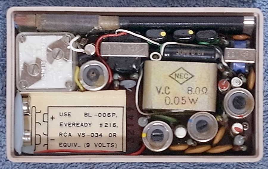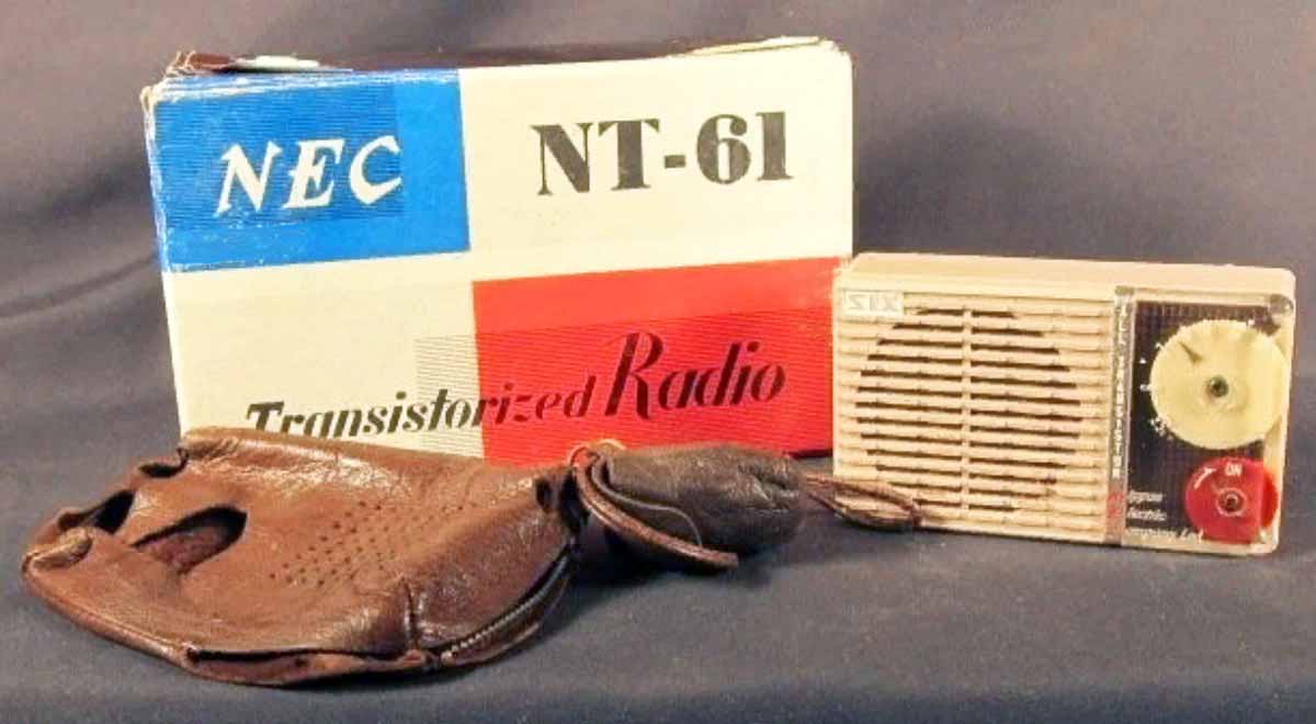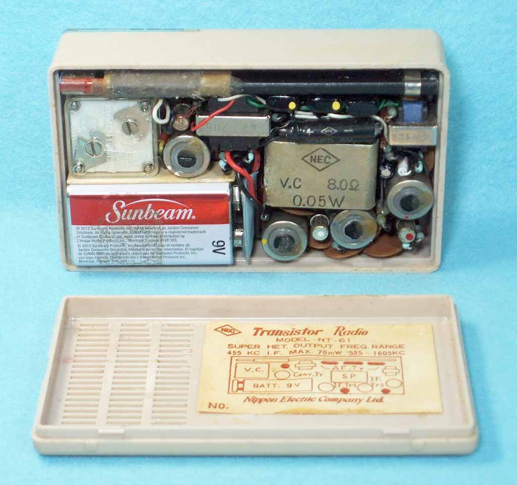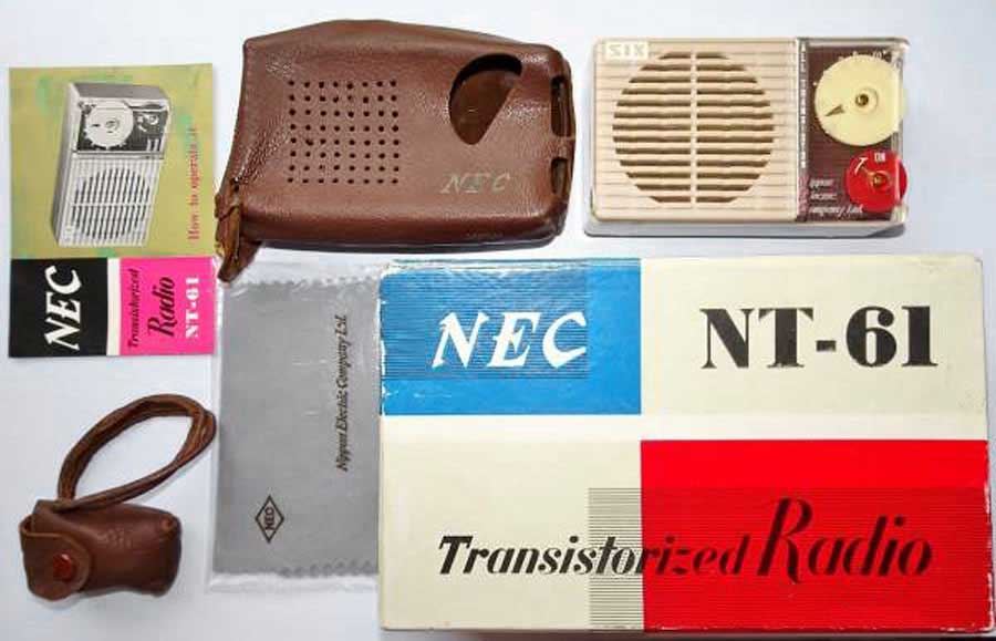 Портативный радиоприёмник "NEC NT-61" выпускался с 1959 года компанией "Nippon Electric". Япония. Супергетеродин. 6 транзисторов. Диапазон MW - 535...1605 кГц. ПЧ-455 кГц. АРУ. Чувствительность ~ 2 мВ/м. Питание - батарея 9 вольт. Максимальная выходная мощность - 70 мВт. Диаметр громкоговорителя - 5,7 см. Диапазон воспроизводимых звуковых частот - 280...3800 Гц. Габариты - 108x64x32 мм. Масса 260 гр.