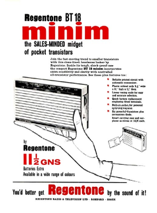 Портативный радиоприёмник "Regentone BT18" (Minim) выпускался с 1961 года компанией "Regentone Products", Великобритания, Лондон. Супергетеродин на шести транзисторах. Диапазоны - LW, MW. ПЧ - 470 кГц. Питание - батарея 9 вольт. Максимальная выходная мощность 200 мВт.