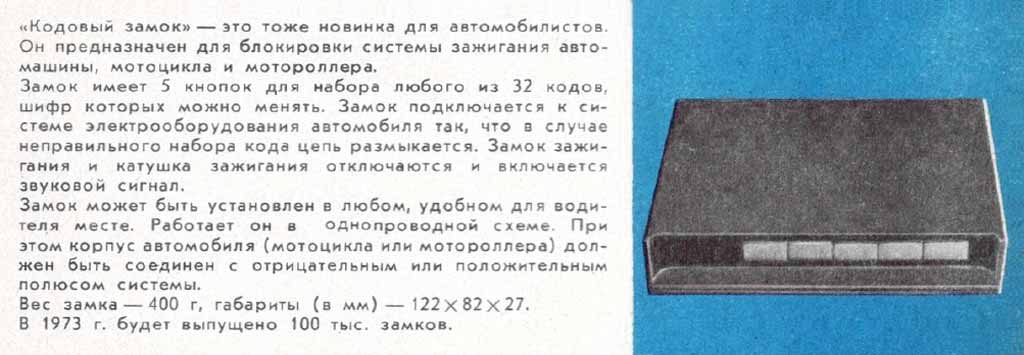Охранное устройство "Кодовый замок" выпущен в 1973 году. Предназначен для блокировки системы зажигания автомобиля, мотоцикла или мотороллера. Имеет 32 кода.