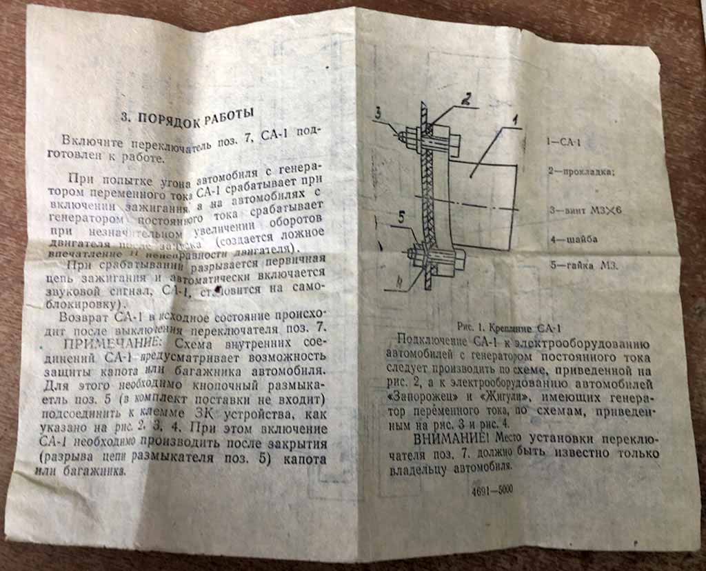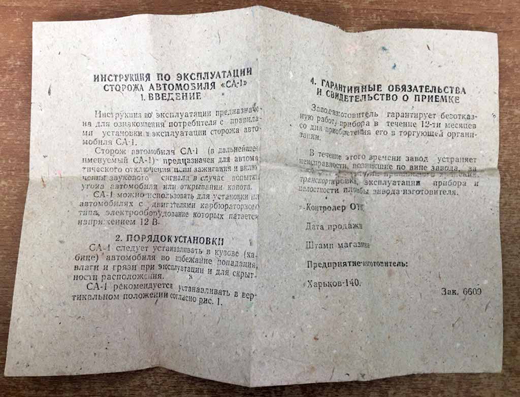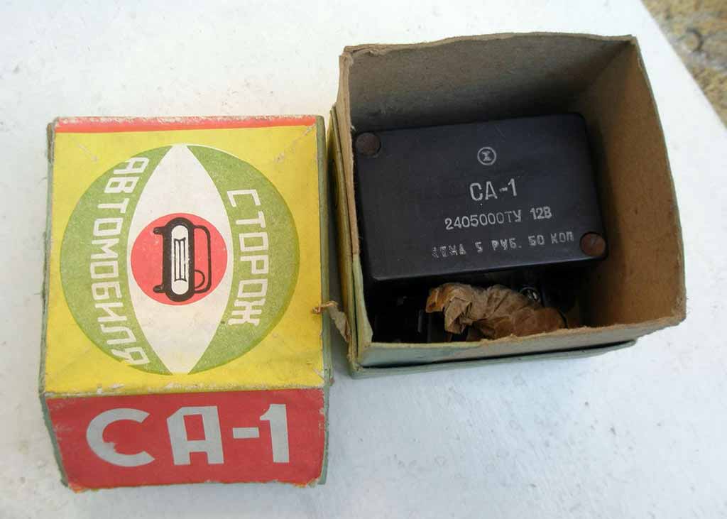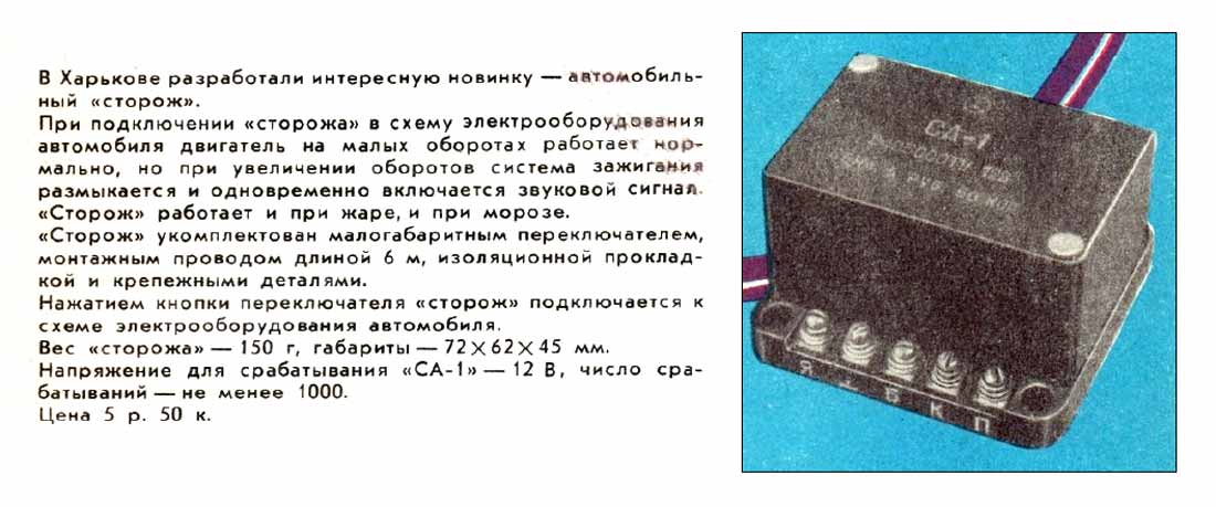 Автомобильный сторож "СА-1" выпускался с 1973 года одним из оборонных заводов Харькова. Противоугонное устройство. При наборе оборотов двигателя блокируется система зажигания и включается сирена.