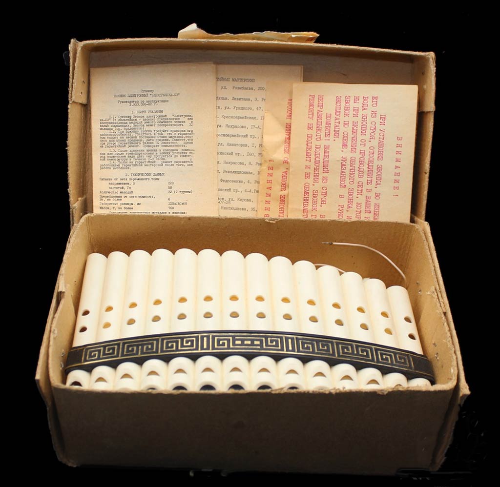 Электронный звонок "Электроника-03" производился возможно с 1987 года Новосибирским заводом при НИИ "Восток". Звонок воспроизводит фрагменты 32 мелодий, каждый звонок новый.