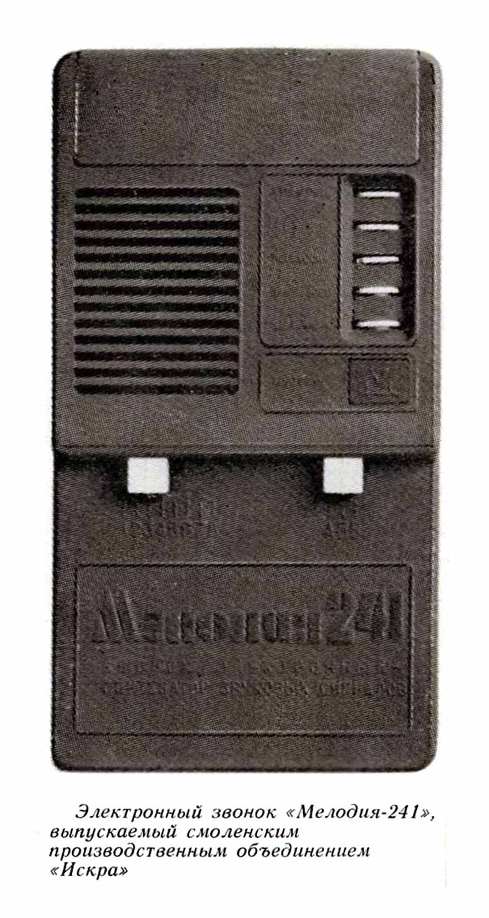 Звонок электронный "Мелодия-241" с 1984 года выпускало Смоленское ПО "Искра". Представляет собой дверной электронный звонок с синтезатором звуковых сигналов.