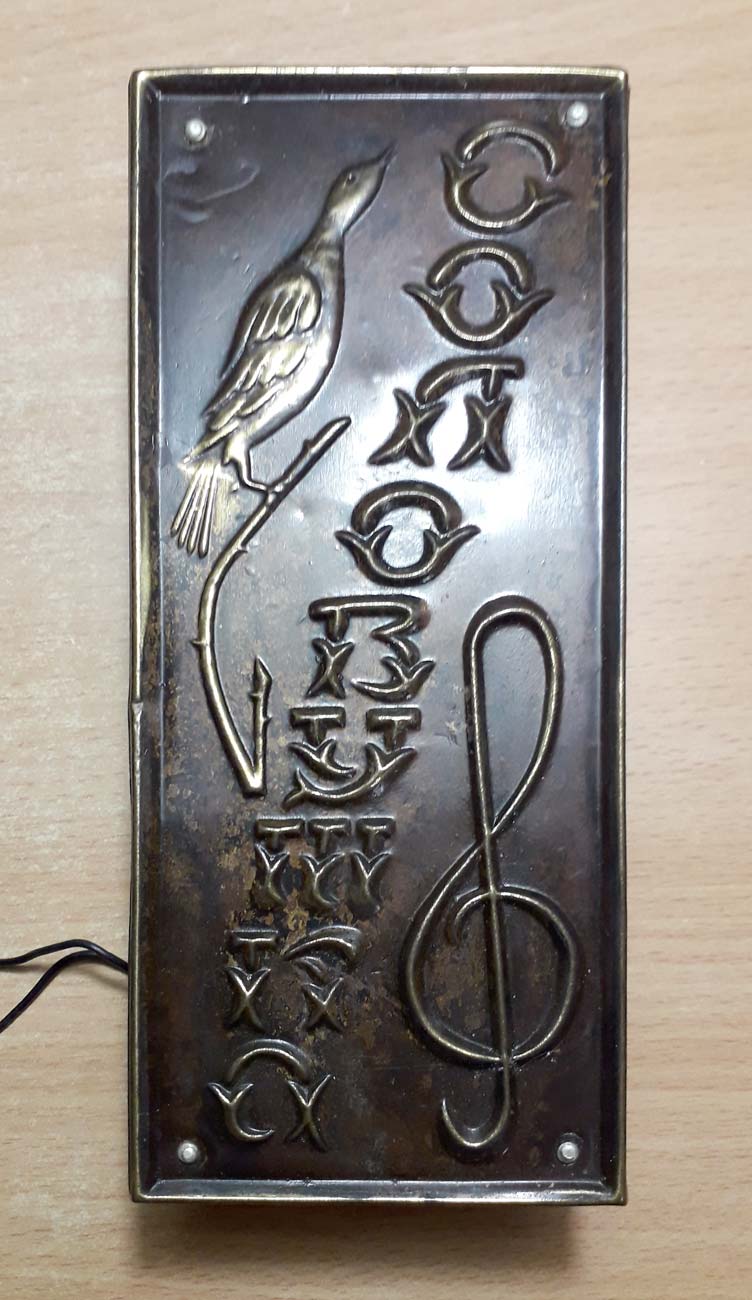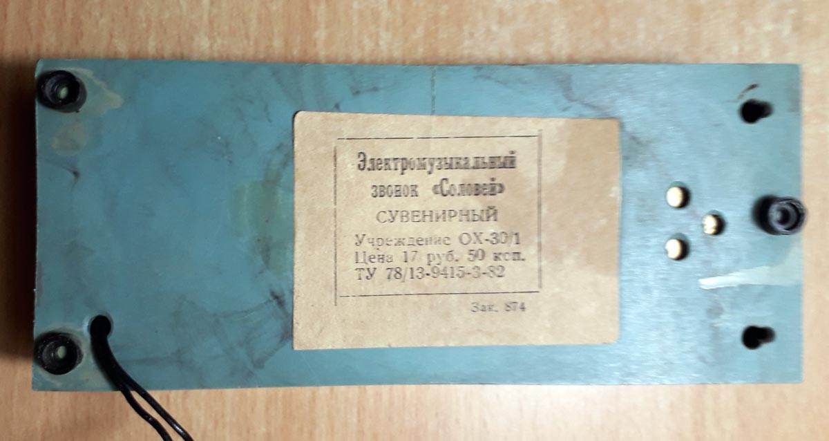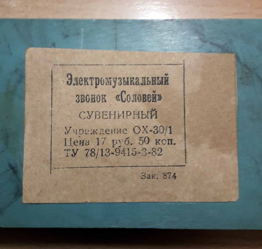 Электромузыкальный звонок "Соловей" (сувенирный) выпускался возможно с 1985 года. Иммитирует трель соловья. Фотографии предоставил Владимир Пушин, Уфа.
