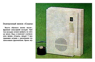 Электронный звонок "Соната" выпускался предположительно с 1982 года. Изготовитель не установлен. Информация о звонке лишь в рекламном проспекте.