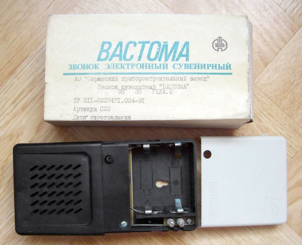 Звонок электронный сувенирный "Вастома" выпускался предположительно с 1992 года АО "Саранский приборостроительный завод". Информации по сувенирному звонку нет.