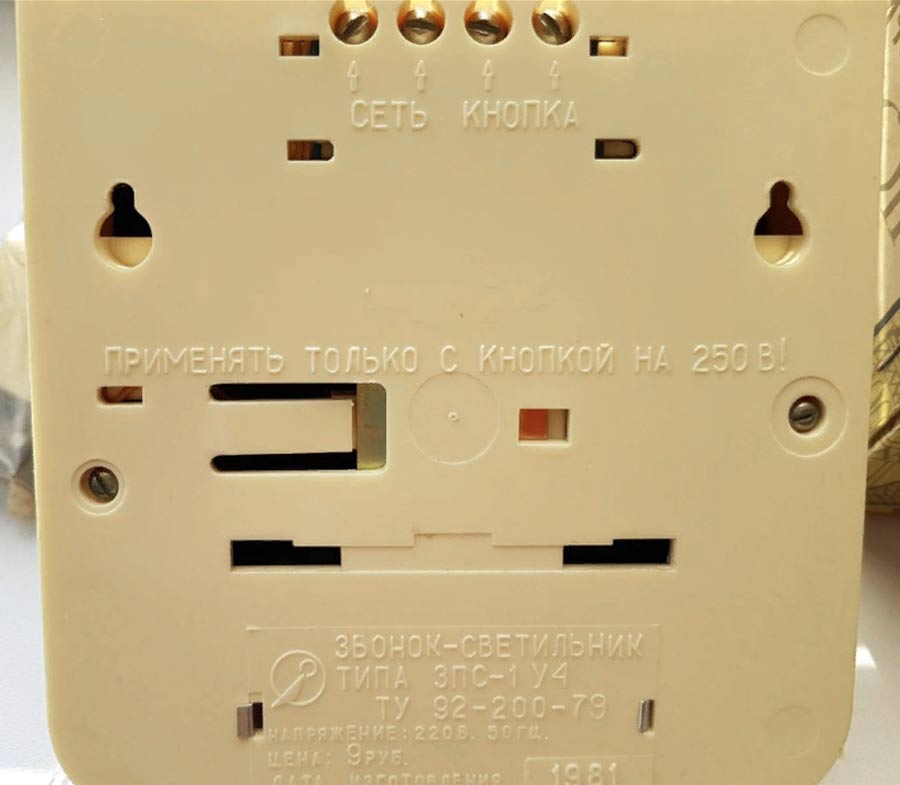 Электрический звонок светильник "ЗПС-1" выпускался возможно с 1980 года. При нажатии кнопки около входа - одновременно включается звонок и светильник.