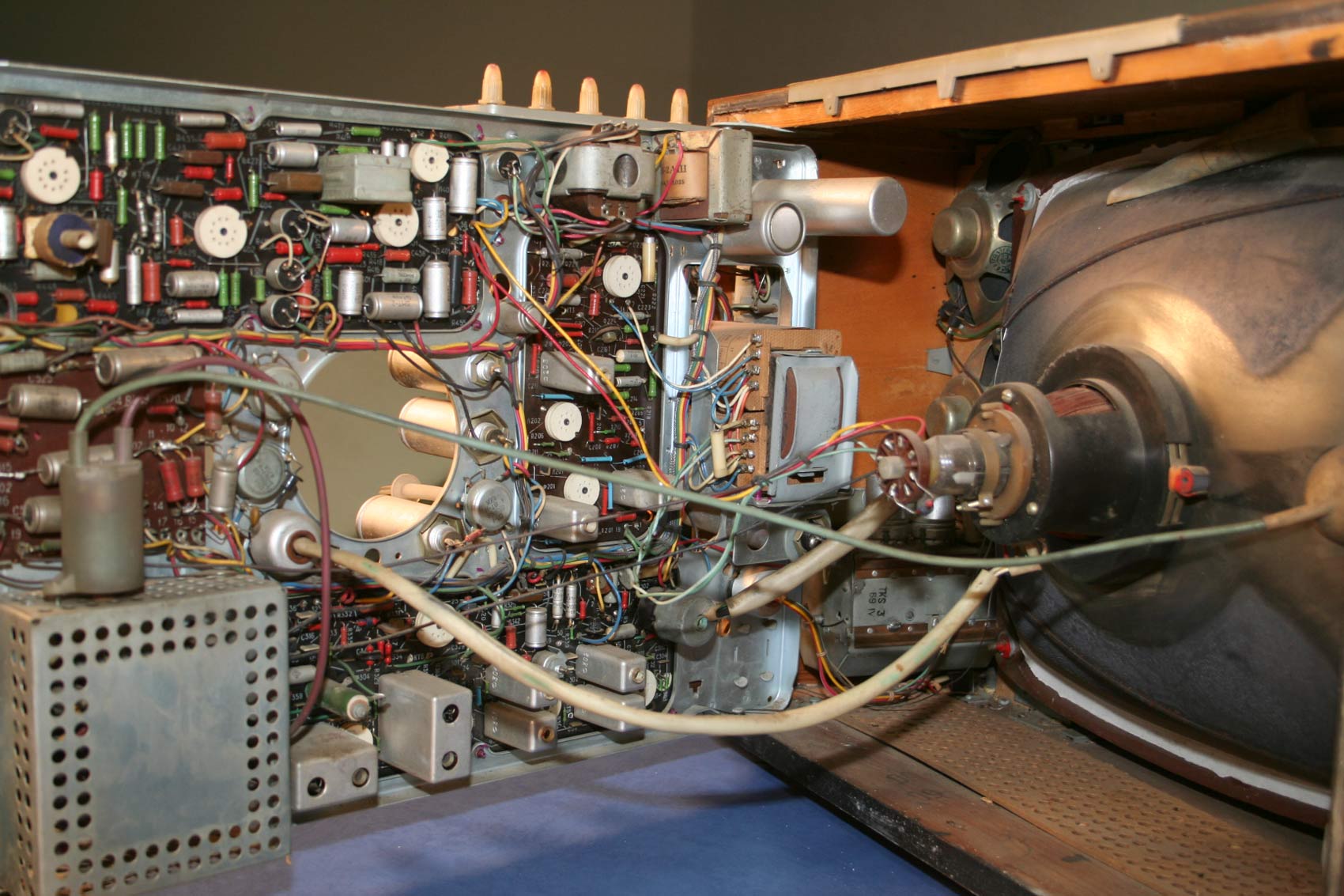 Телевизор ''Берёзка-3'' (УНТ-59-I) имеет кинескоп типа 59ЛК2Б, 17 ламп