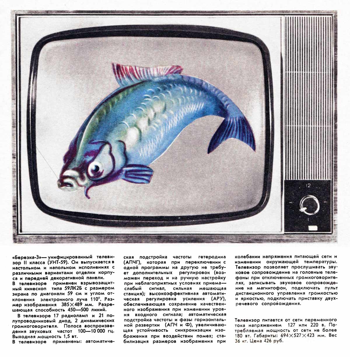 22 п/п прибора. Его габариты 595х505х350 мм. Вес 26 кг. Телевизор ''Берёзка-2-1''