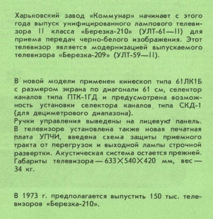 телевизор "Берёзка-210" с 1973 года выпускал Харьковский завод "Коммунар".