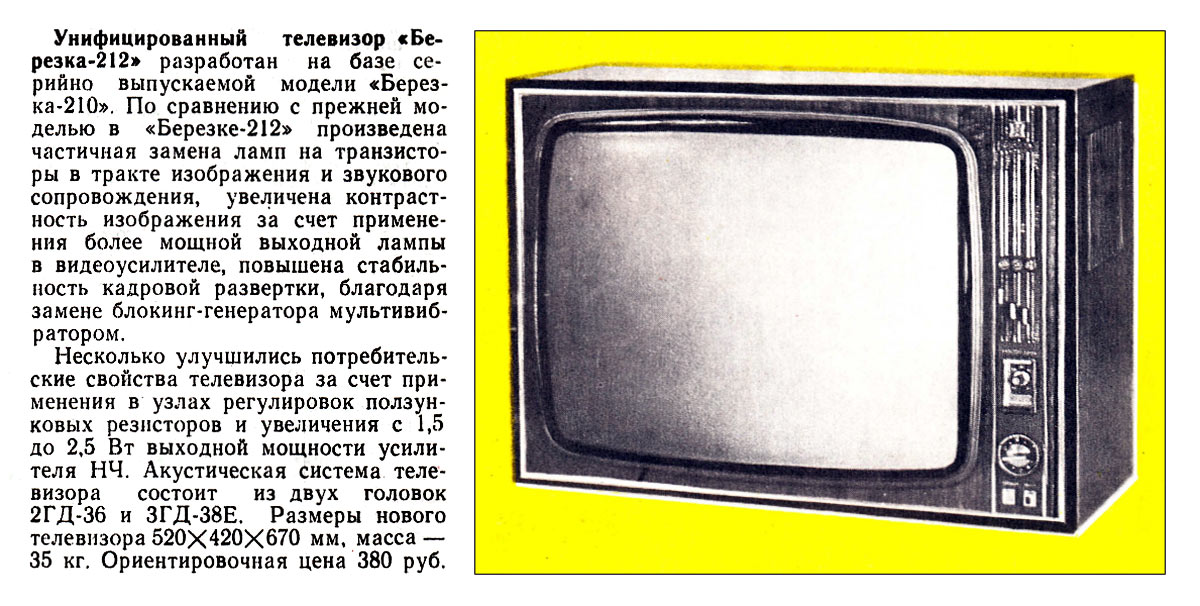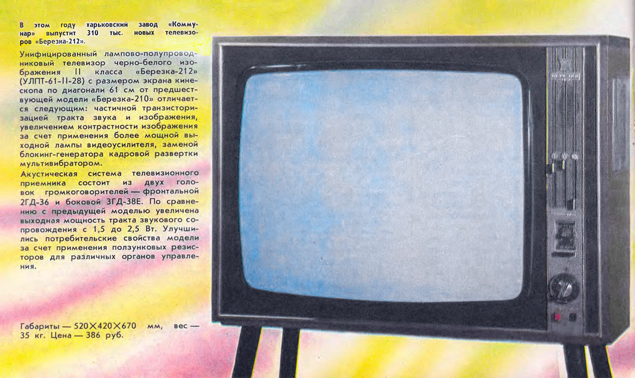 приёмник чёрно-белого изображения "Берёзка-212" с 1974 года выпускал Харьковский