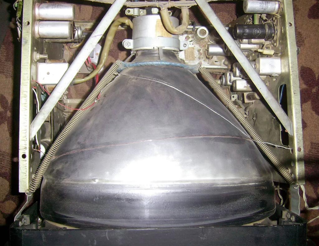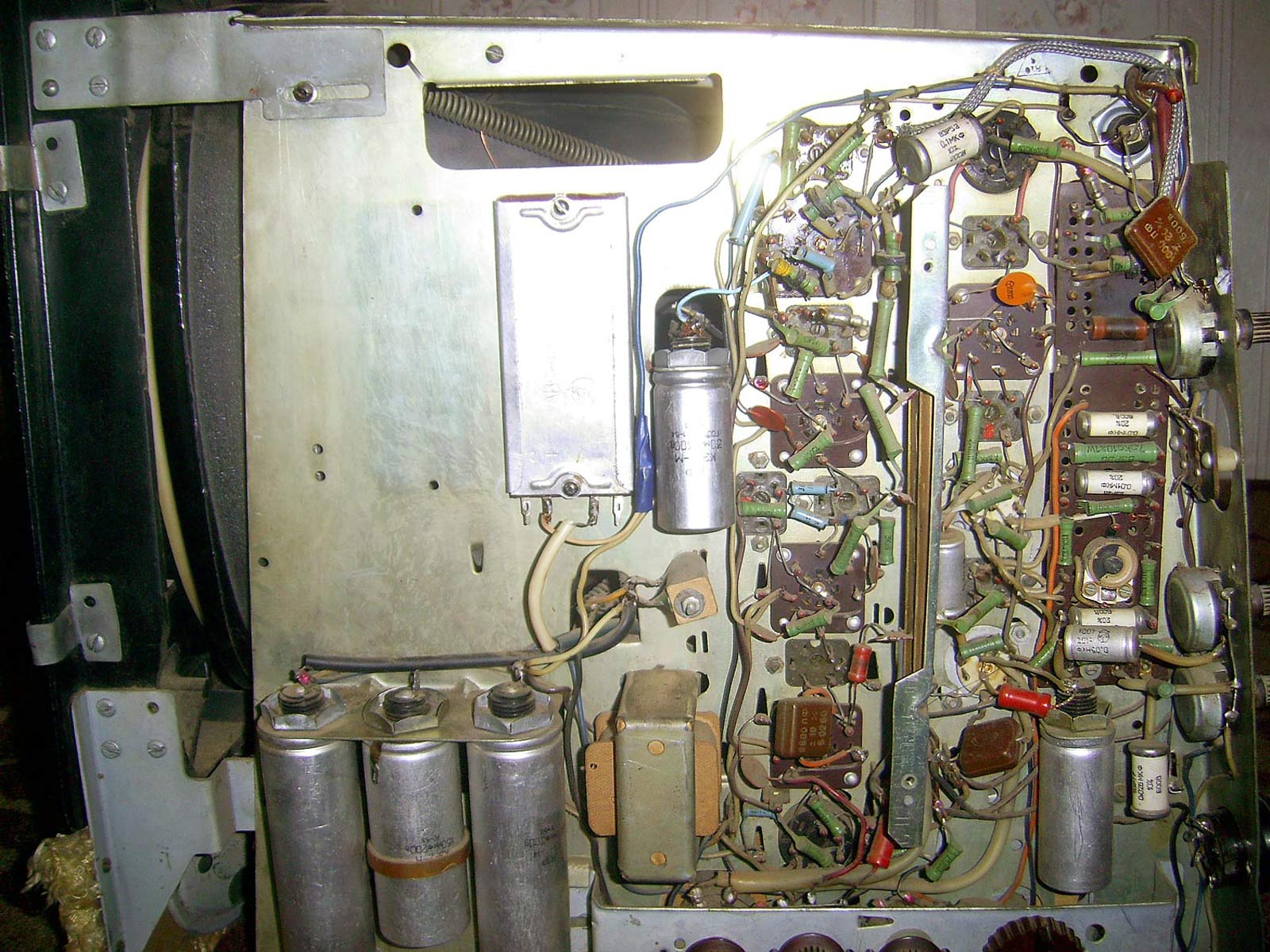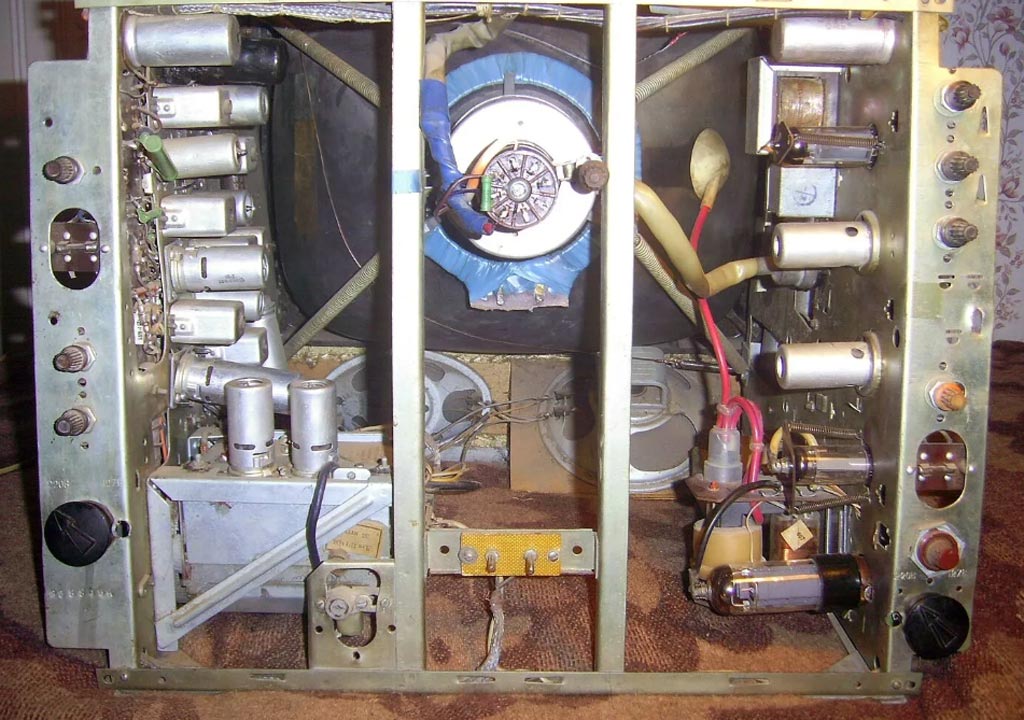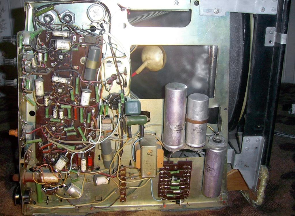 кинескоп и громкоговорители с отражательной доской. Всё размещено в деревянном