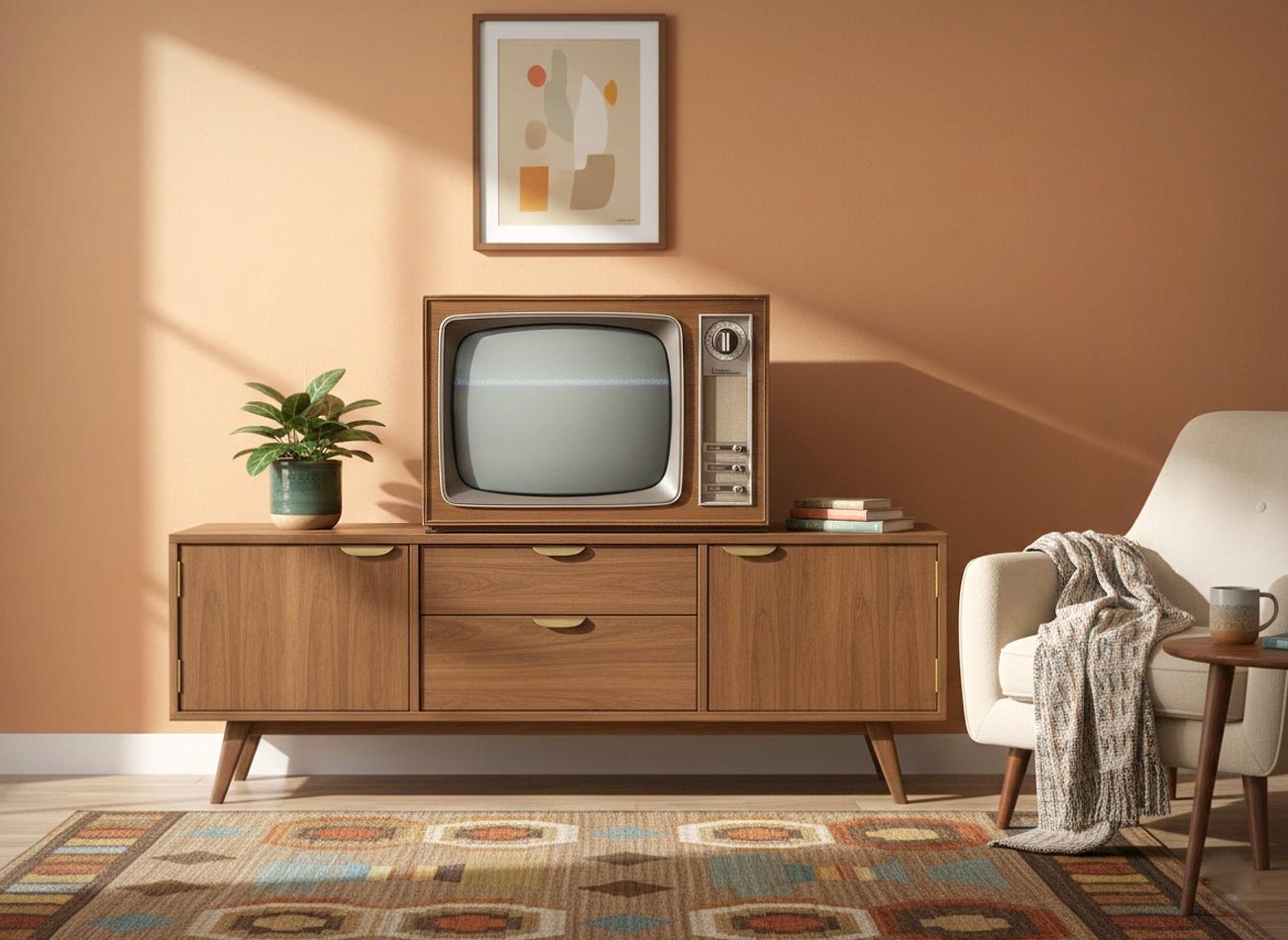 изображения 360х270 мм. Размеры футляра 590х355х220 мм. Прогрессивный телевизор