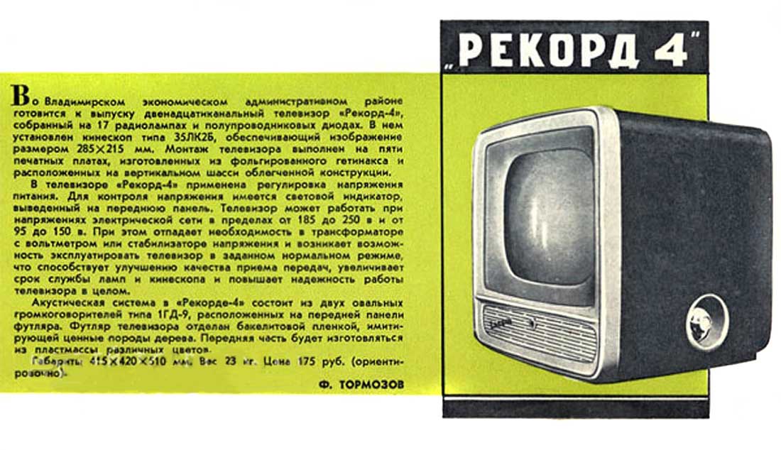 и механизации. Телевизор ''Рекорд-4'' это модель 3-класса разработанная
