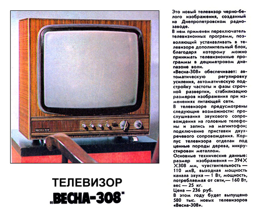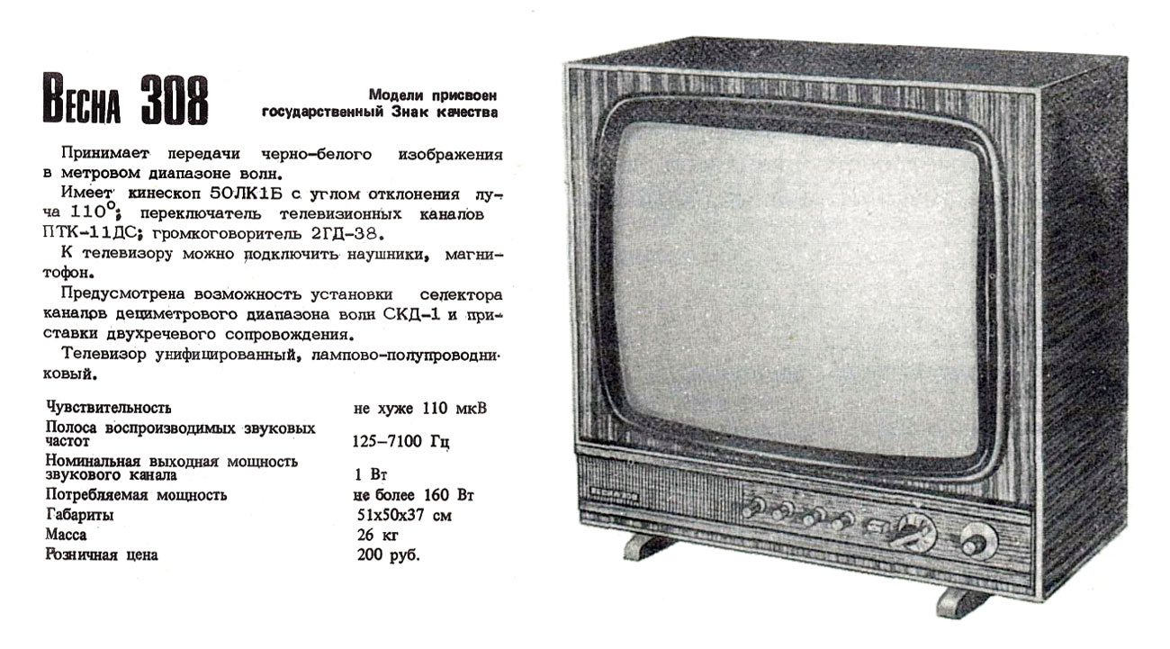 телевизор ч/б изображения "Весна-308" (3УЛПТ-50-III-1) с I-кв 1977 года