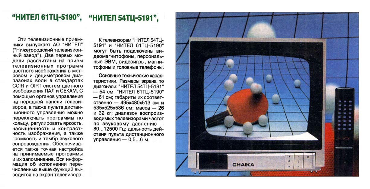 Цветные телевизоры "Нител 61ТЦ-590" и "Нител 54ТЦ-5191" с 1995 года выпускало АО "Нител". Унифицированные стационарные телевизоры цветного изображения 5-го поколения.