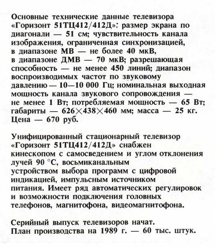 Унифицированный стационарный телевизионный приёмник цветного изображения "Горизонт 51ТЦ-412/412Д" (И/ИД) производился с 1989 года Минским ПО "Горизонт". Телевизор выпускался со знаком качества.