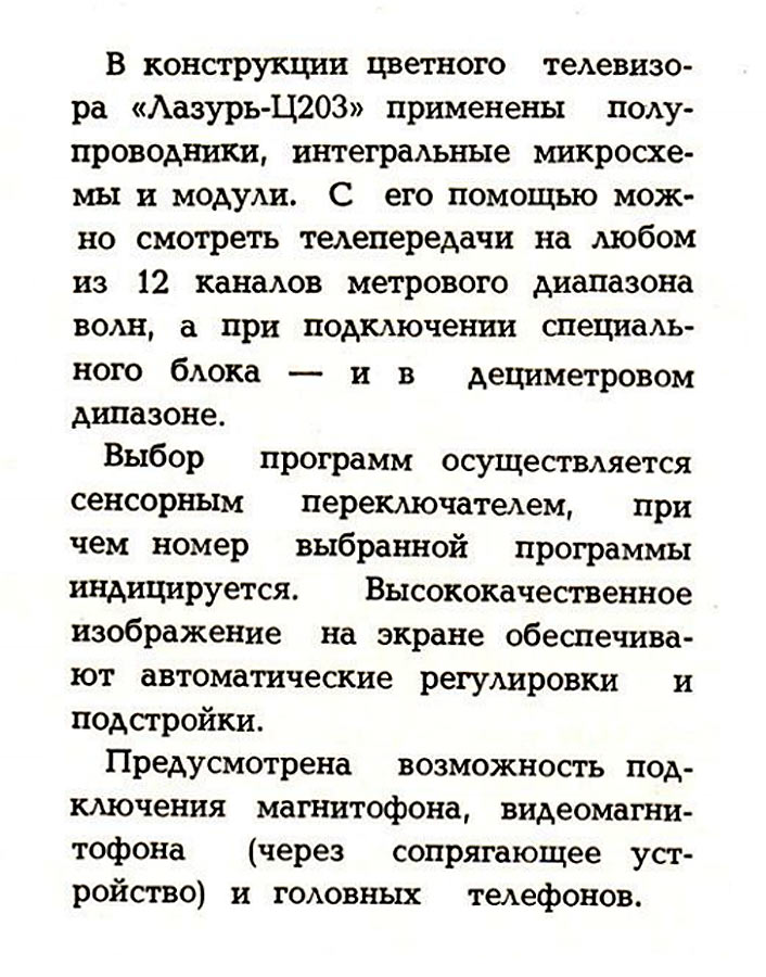 Унифицированный цветной телевизионный приёмник "Лазурь Ц-203" подготовил к выпуску с 1984 года Сормовский телевизионный завод "Лазурь".