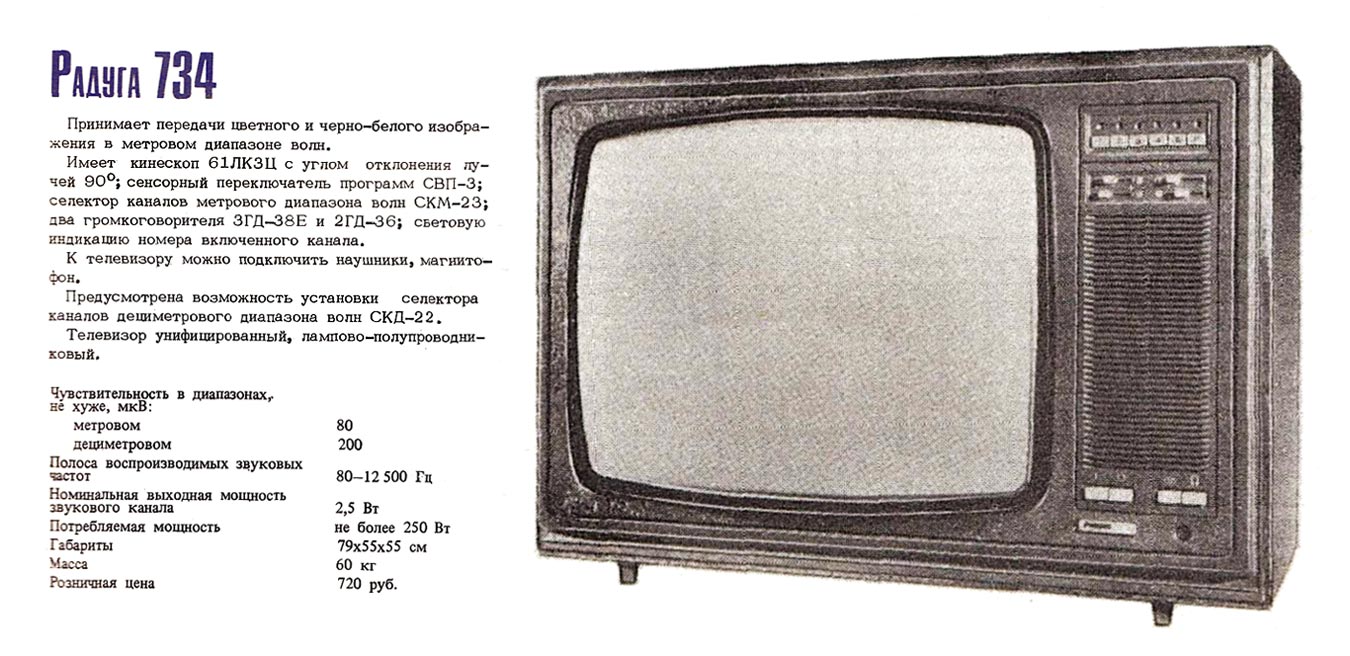 Цветной телевизор "Радуга-734" разработан КБ Ленинградского ПО имени Козицкого в 1983 году. В серию с 1984 года пошёл телевизор с таким наименованием, но с другим оформлением.