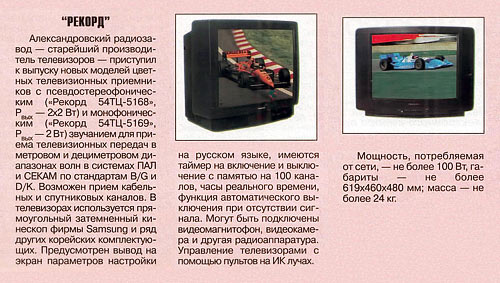 Цветные телевизоры "Рекорд 54ТЦ-5168" и "Рекорд 54ТЦ-5169" с 1998 года выпускал Александровский радиозавод. Радио-6-98.