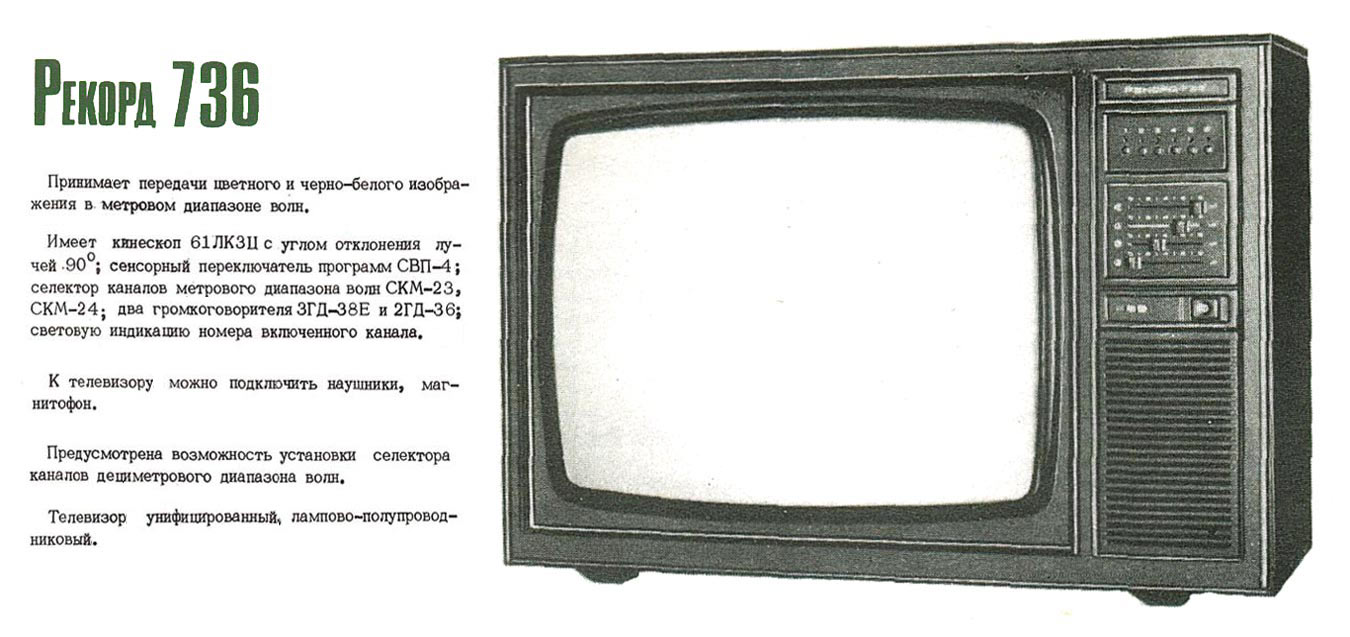 Цветной телевизионный приёмник "Рекорд-736" подготовил к выпуску с 1980 года "Александровский радиозавод". В производство ТВ не пошёл.